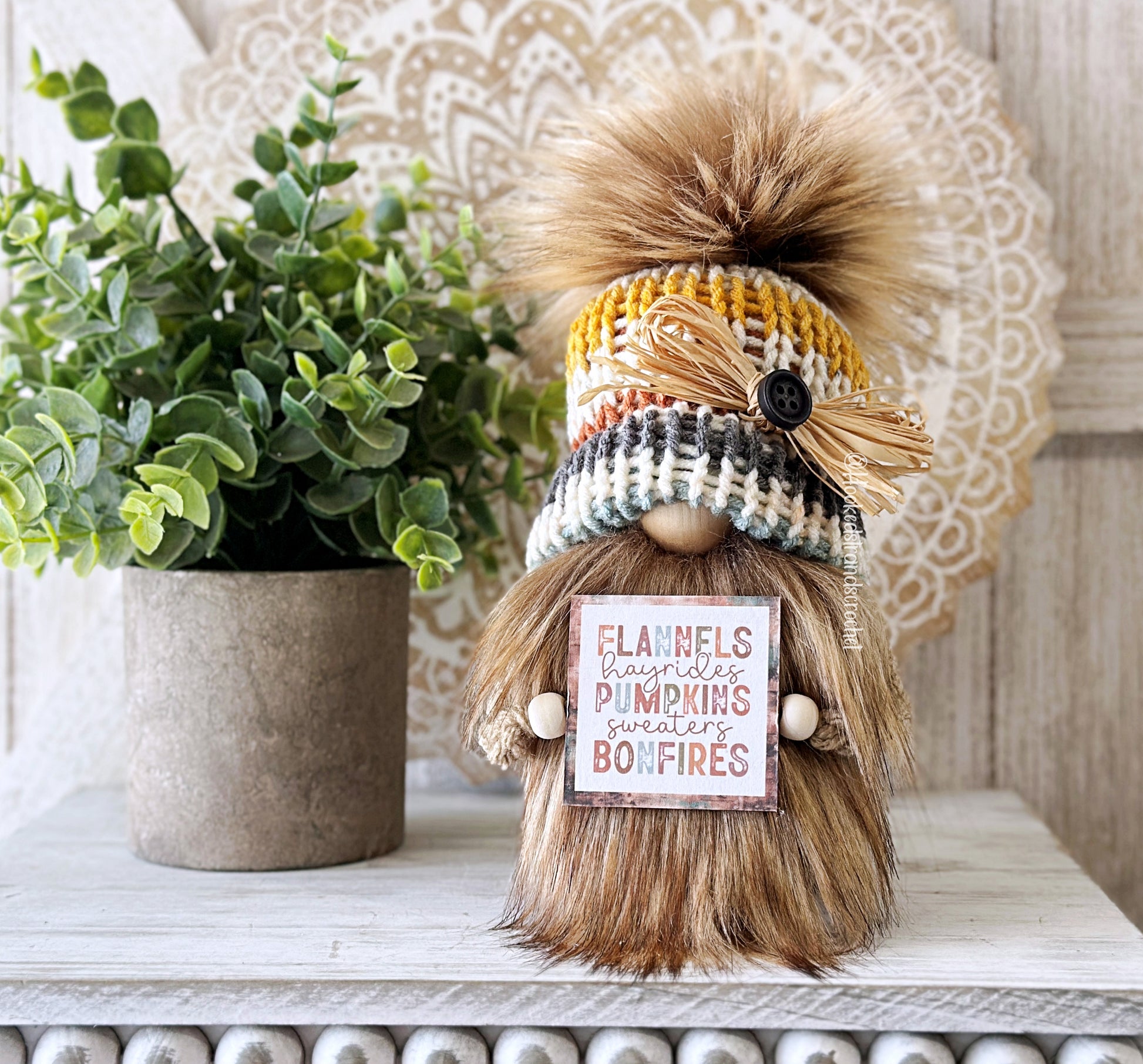 Welcome the cozy vibes of autumn into your home with this charming Autumn gnome. Adorned with a striped hat and holding a delightful sign, this adorable gnome is the perfect addition to your fall decor for tiered trays. Handcrafted with care, this whimsical piece will bring a touch of seasonal cheer to any corner of your space. Whether displayed on a shelf, mantel, or tiered tray, this Autumn gnome is sure to spread smiles and warm autumn spirit throughout your home.