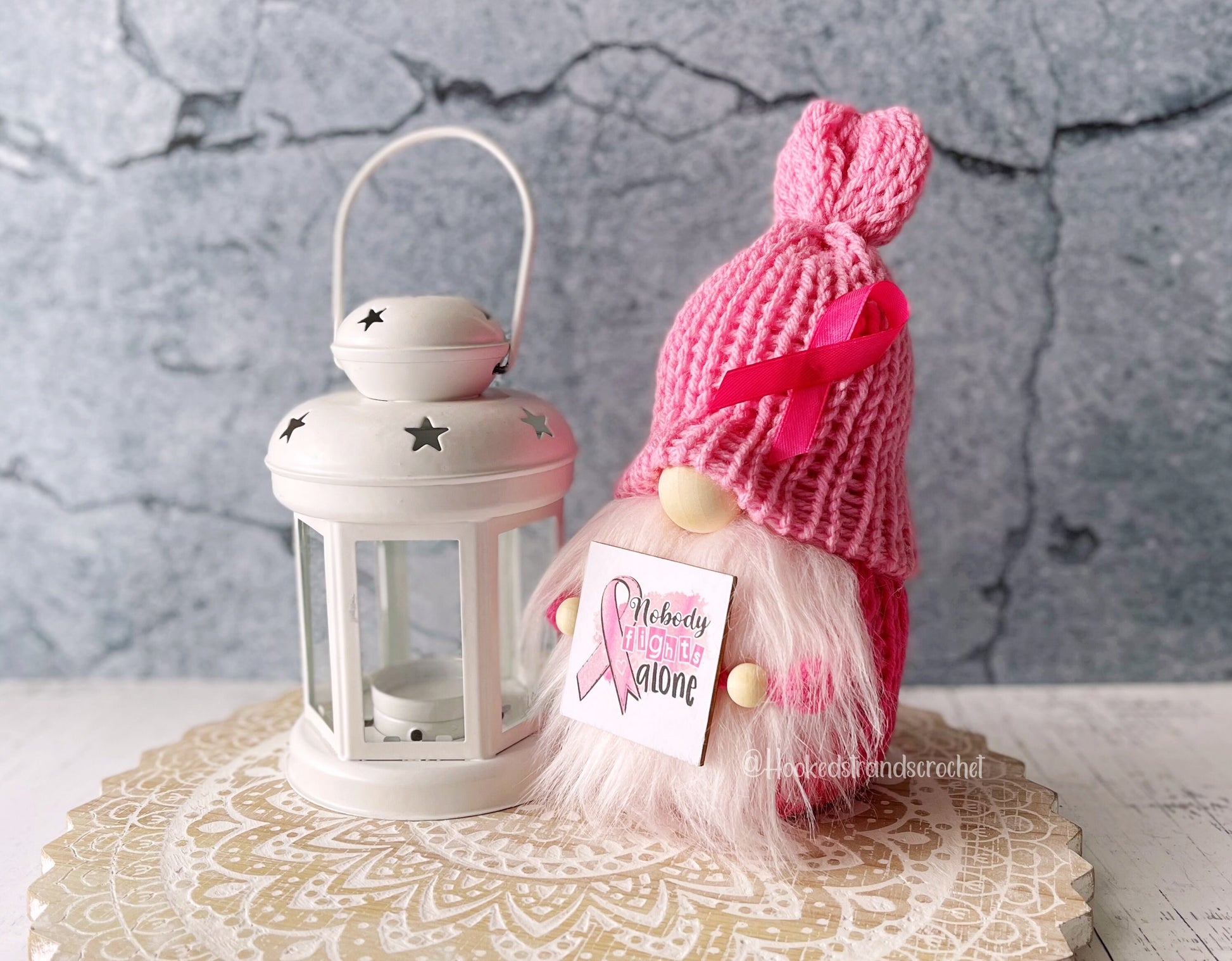This breast cancer gnome is a great way to show your support for finding a cure. The knit gnome is made in shades of pink and comes with your choice of sign.