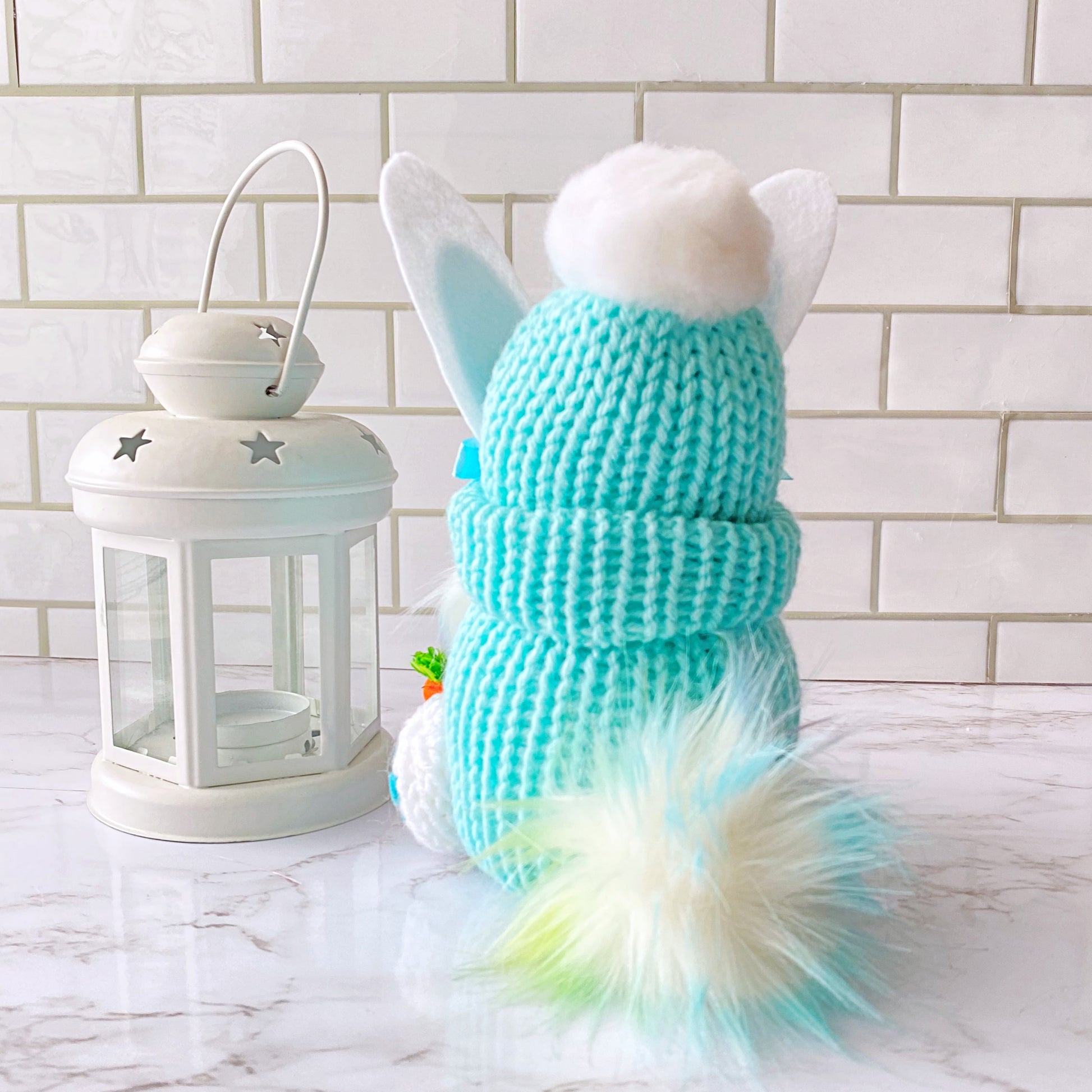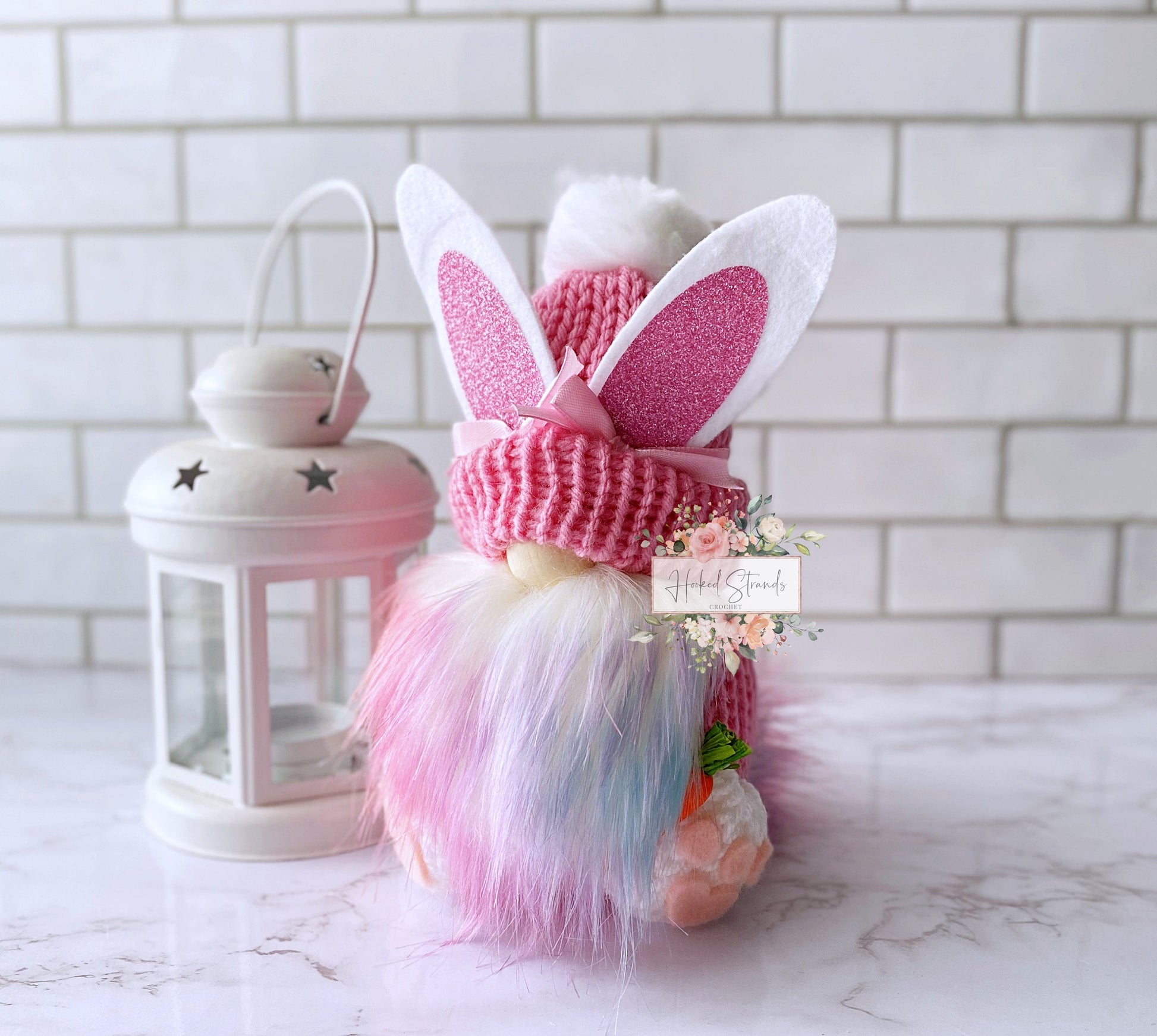 This easter gnome is a cute colorful addition to your tiered tray decor or easter decor. The bunny gnome has a rainbow-colored beard and a furry pom tail. The rabbit ears have a sparkly inner ear and little feet with felt heart pads.