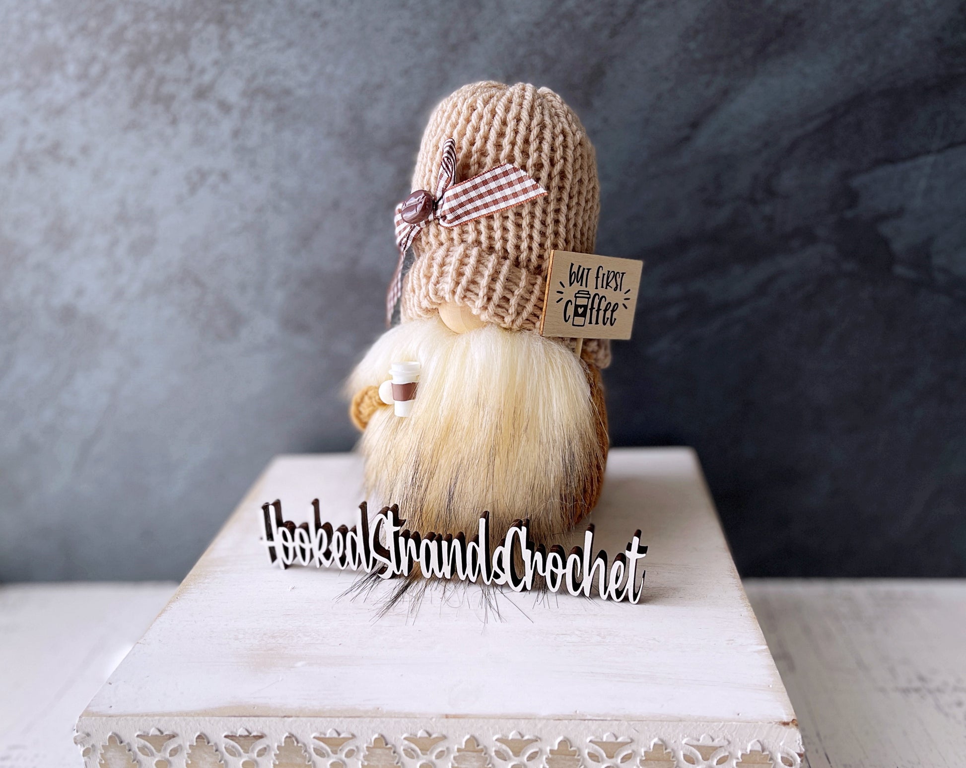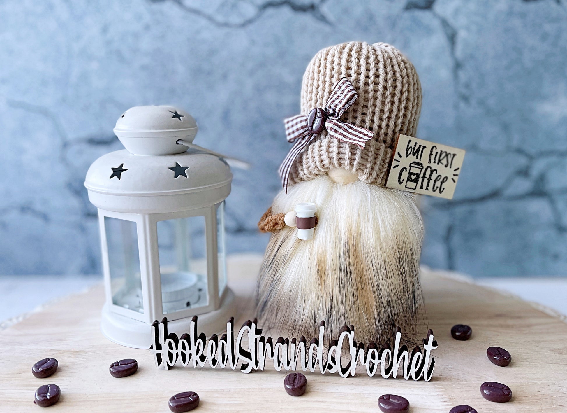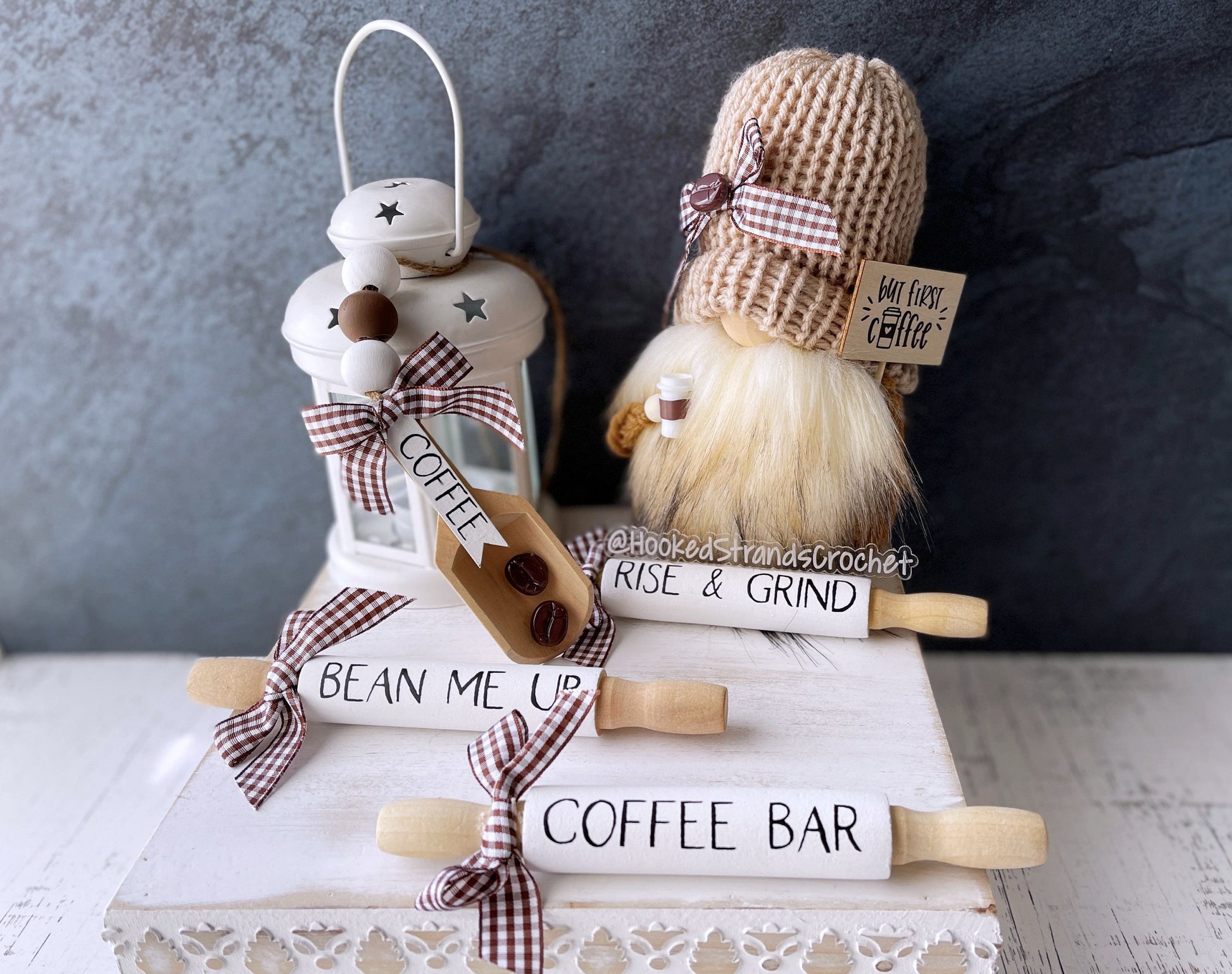This knit gnome has a sign that reads "But first coffee" and holds a coffee cup. Add a rolling pin or the coffee scoop to complete your coffee themed decor!