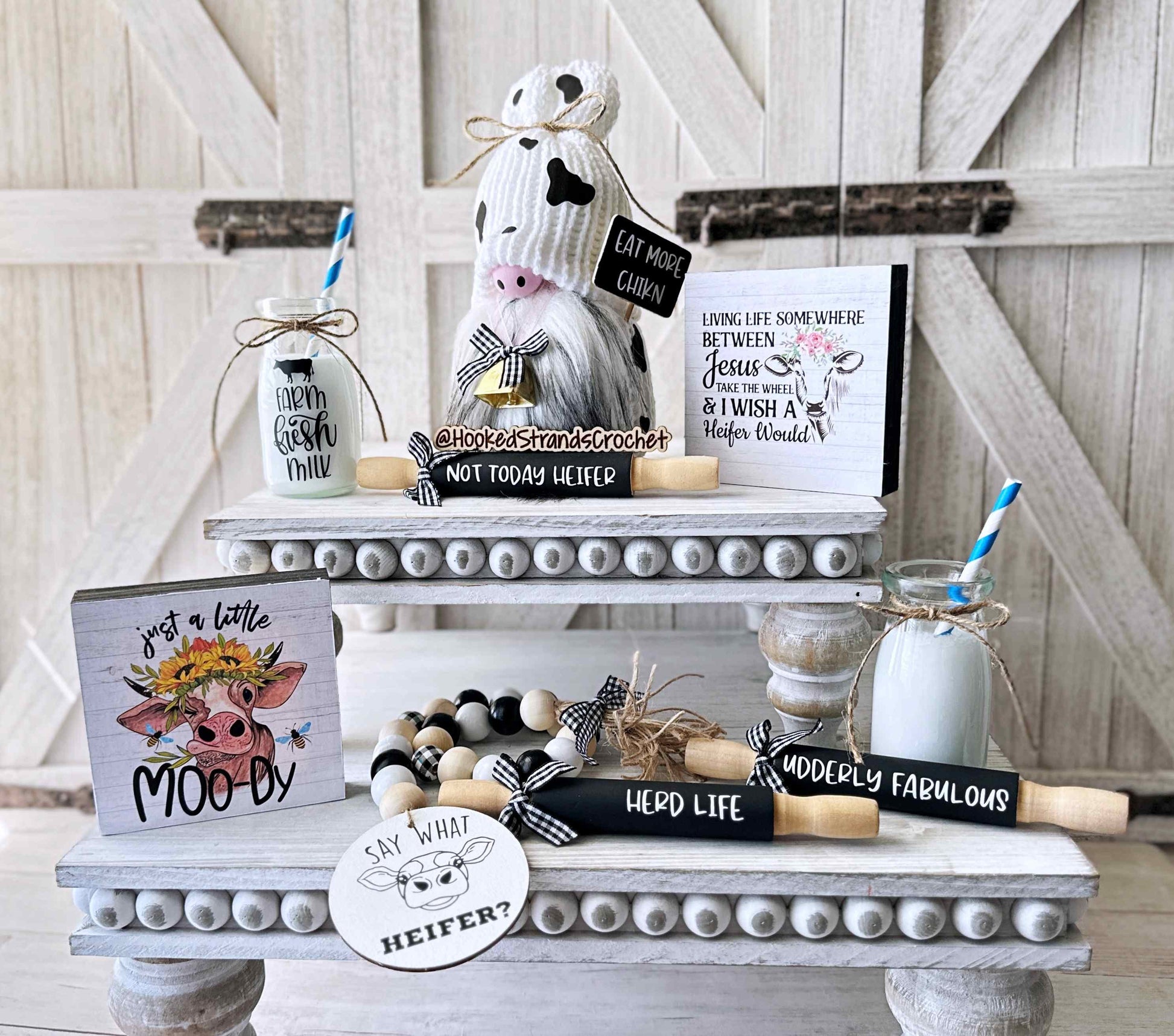 Cow gnome, Heifer decor, Tiered tray decor, Farm decor, Gift idea, Rolling pins, Milk bottle, Bead Garland Farmhouse decor