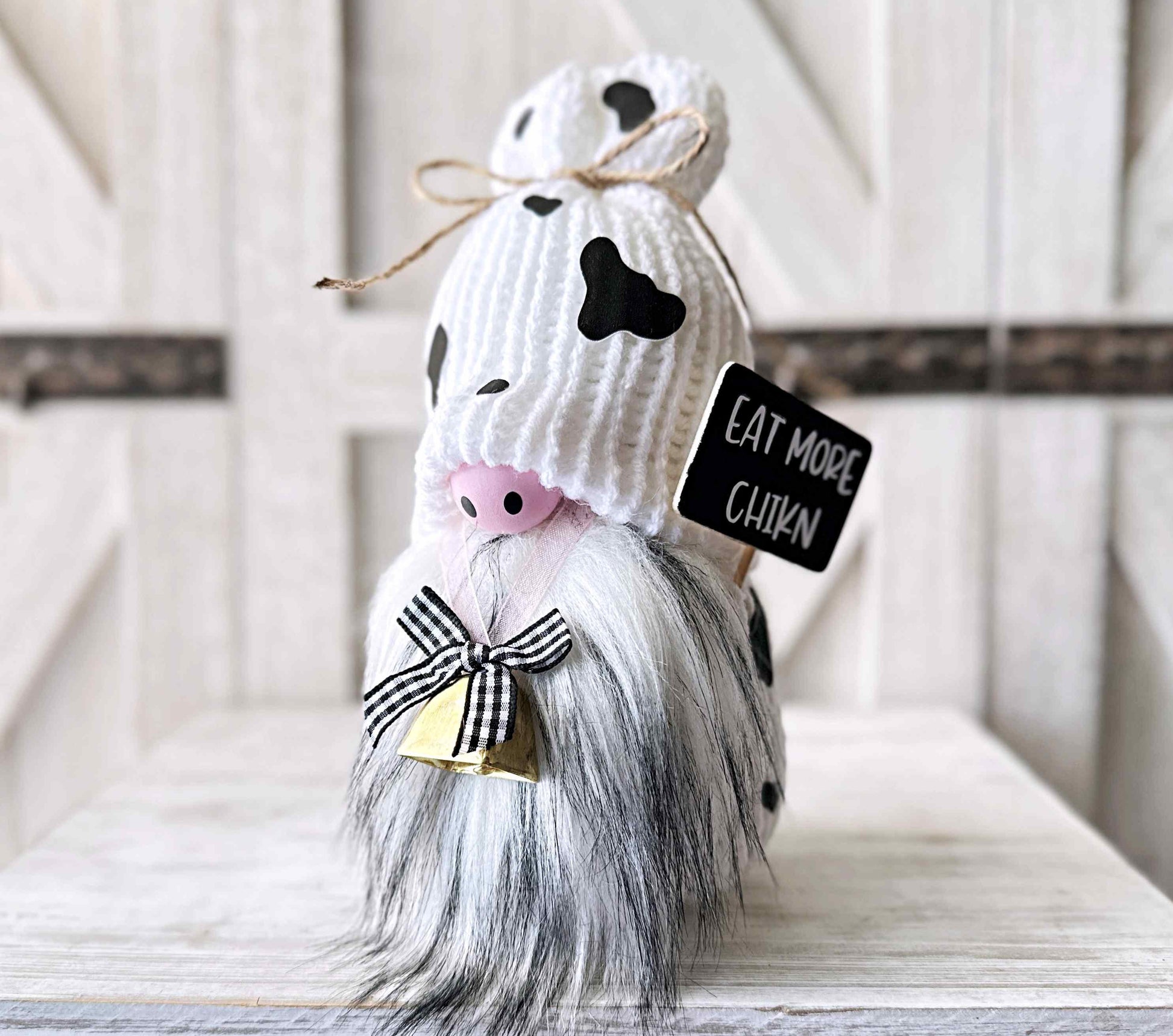 🐮Cow gnome - Has spots all over, a gold cowbell and a removable sign asking you to "Eat more Chikn"