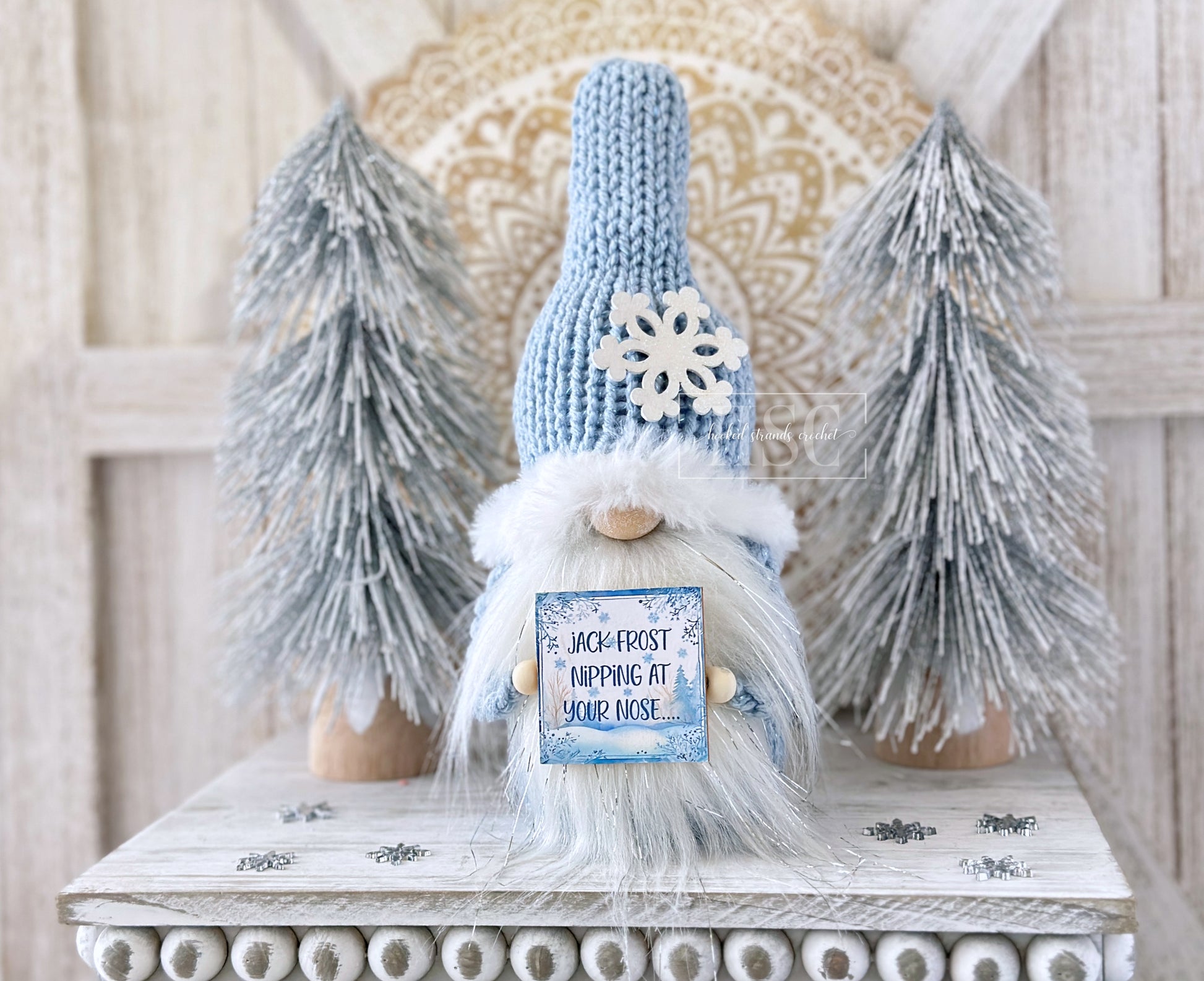 Introducing our charming Jack Frost Winter Gnome, the perfect addition to your Christmas decor. This adorable gnome brings a touch of enchantment to any space, whether displayed on a tiered tray or as a stand-alone decoration. Expertly crafted by hooked strands crochet, this delightful gnome features intricate details and a cheerful expression that will surely warm your heart throughout the holiday season. With its whimsical design and festive spirit, our Jack Frost Winter Gnome is sure to be a treasured piece in your holiday collection.