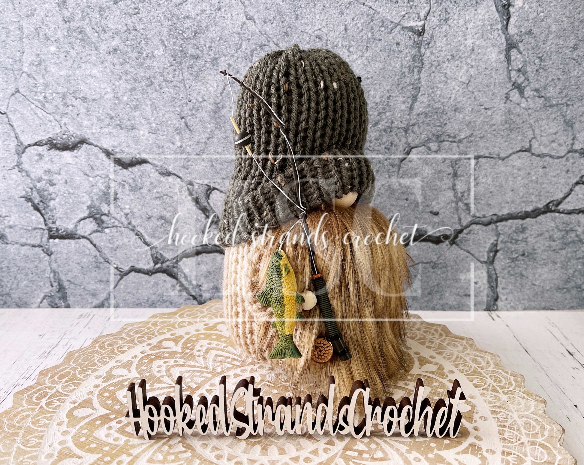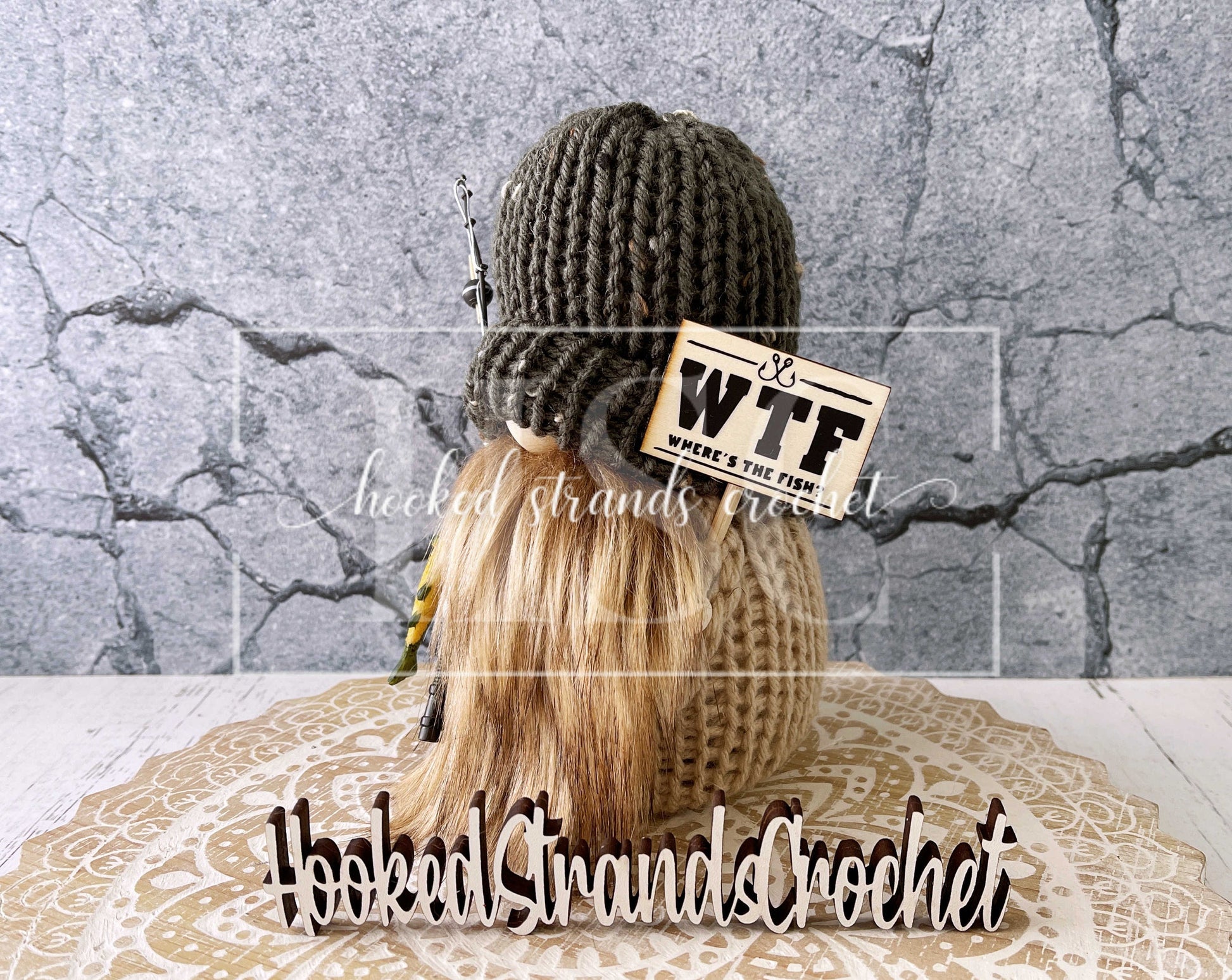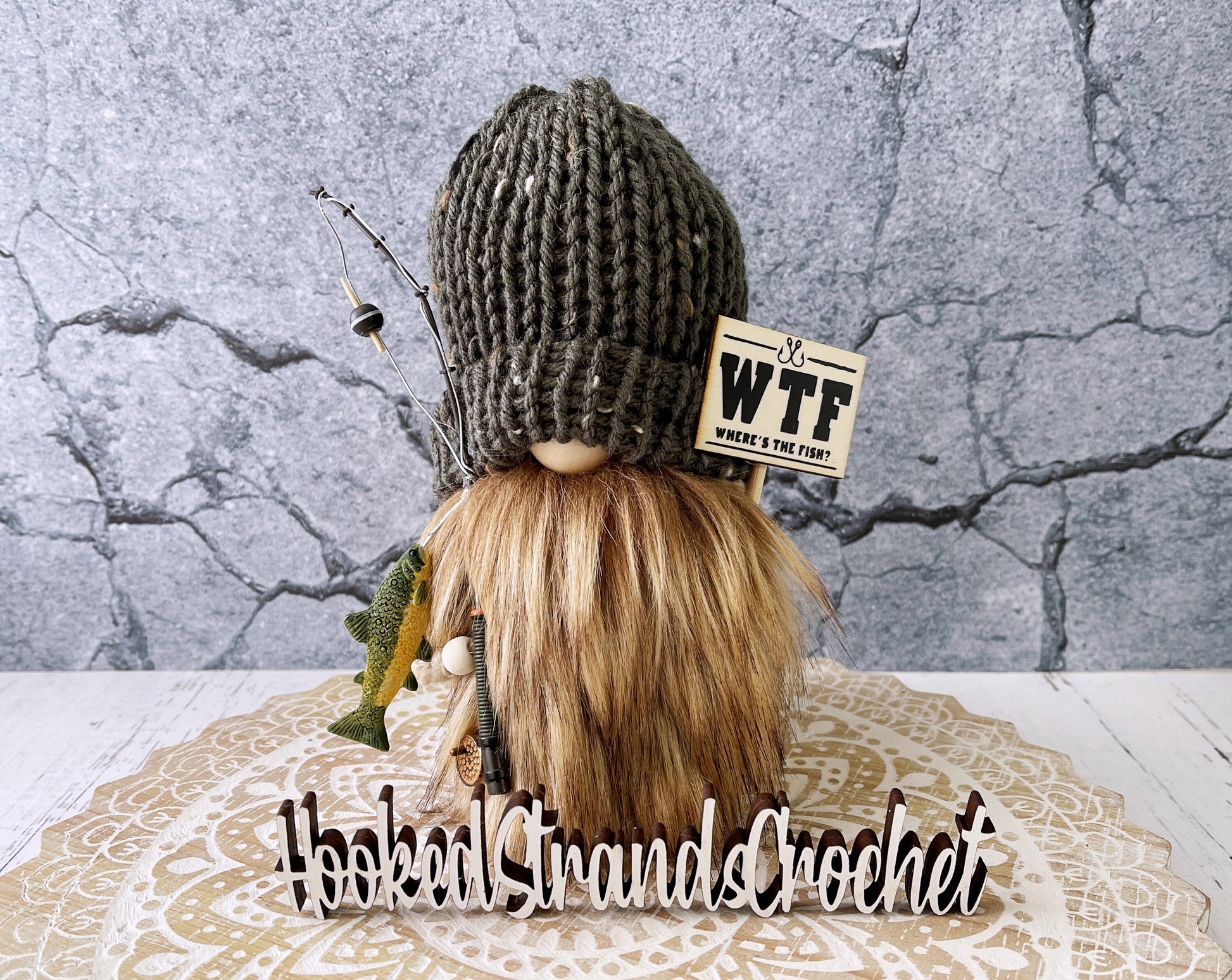 Charming knit fisherman gnome with "WTF Where's the fish?" sign - Gift for Dad - Tiered tray decor