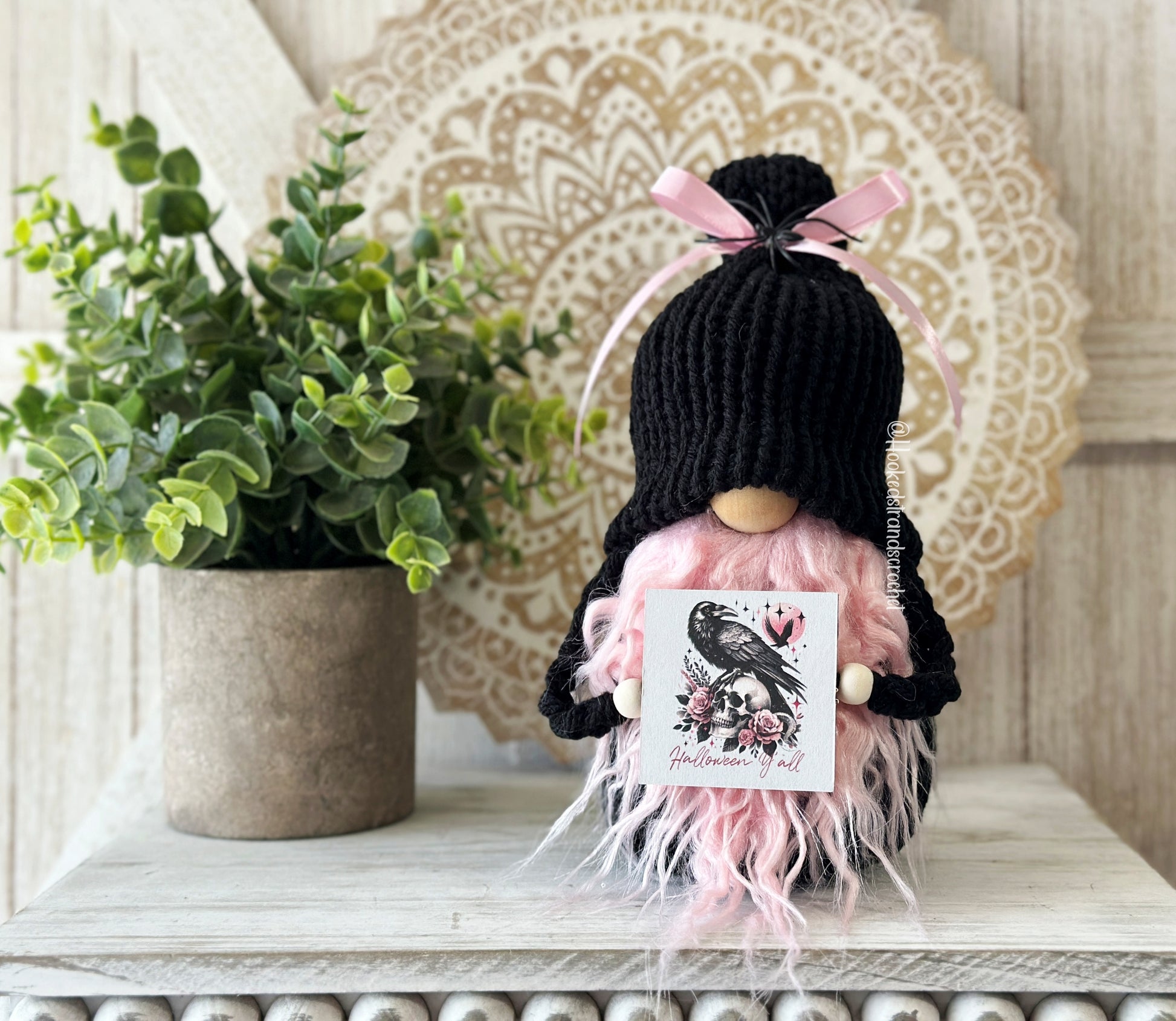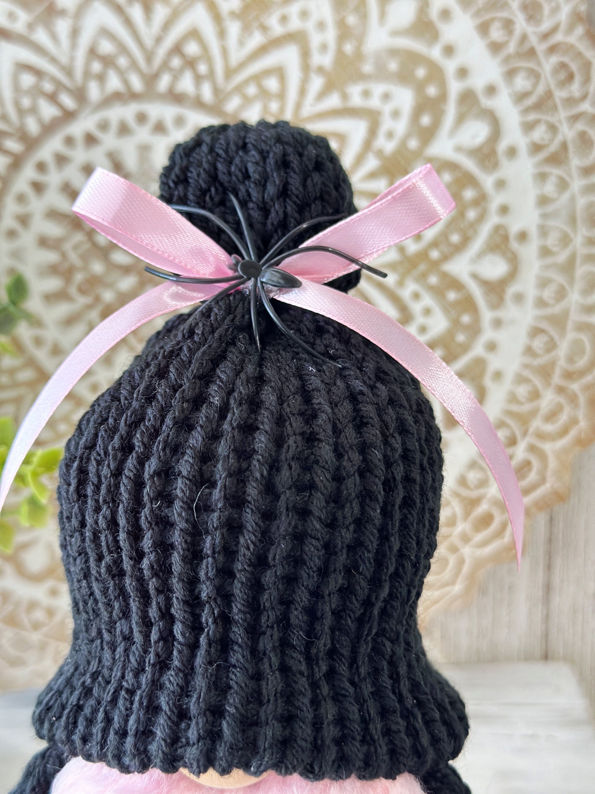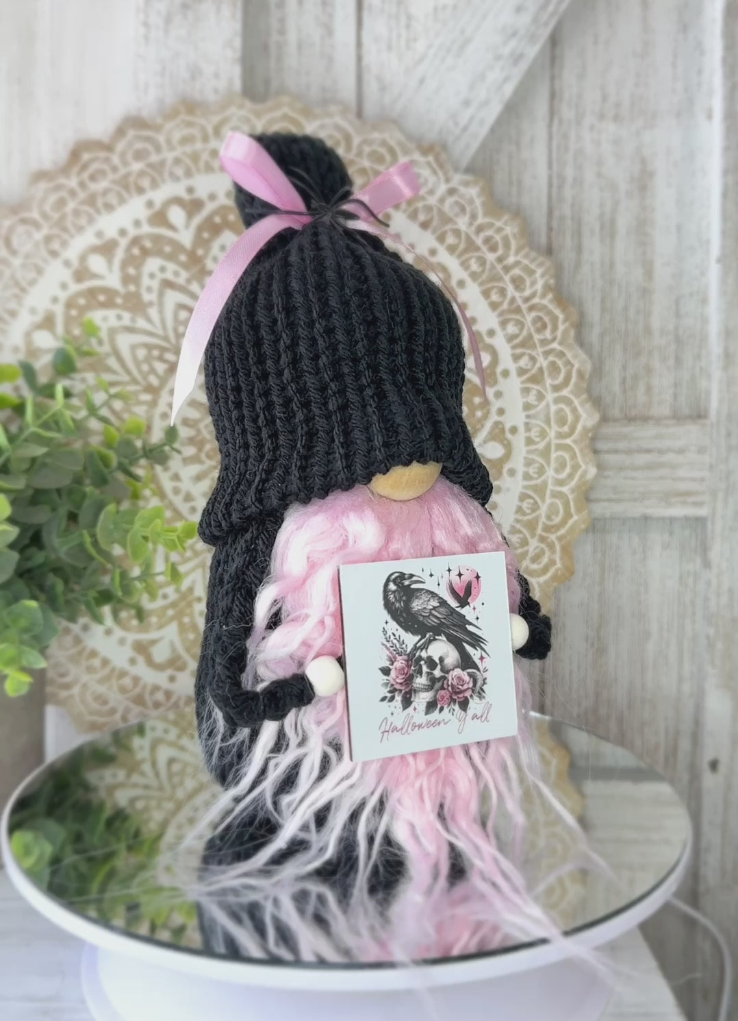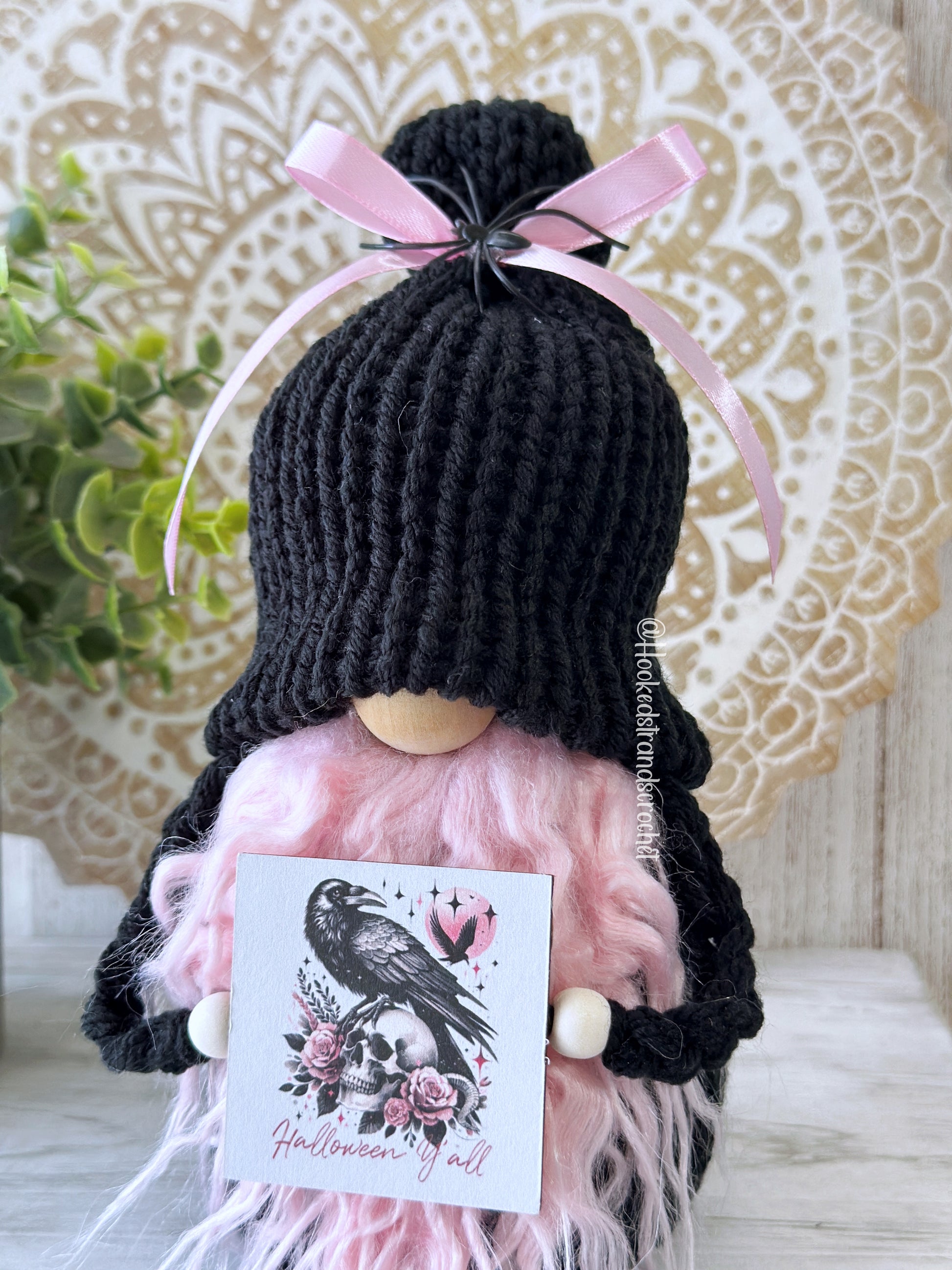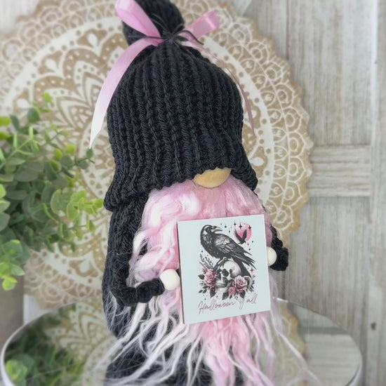 Add a touch of Gothic spookiness to your Halloween decor with this spooky black and pink Halloween gnome with sign! Perfect for tiered tray displays or as a ghoulish gift for her, this unique gnome will add some witchy vibes and quirky charm to your home. Handcrafted with attention to detail, this cute little gnome is sure to bring a smile to your face all season long. Make your Halloween celebrations even more fun with this one-of-a-kind decor piece!