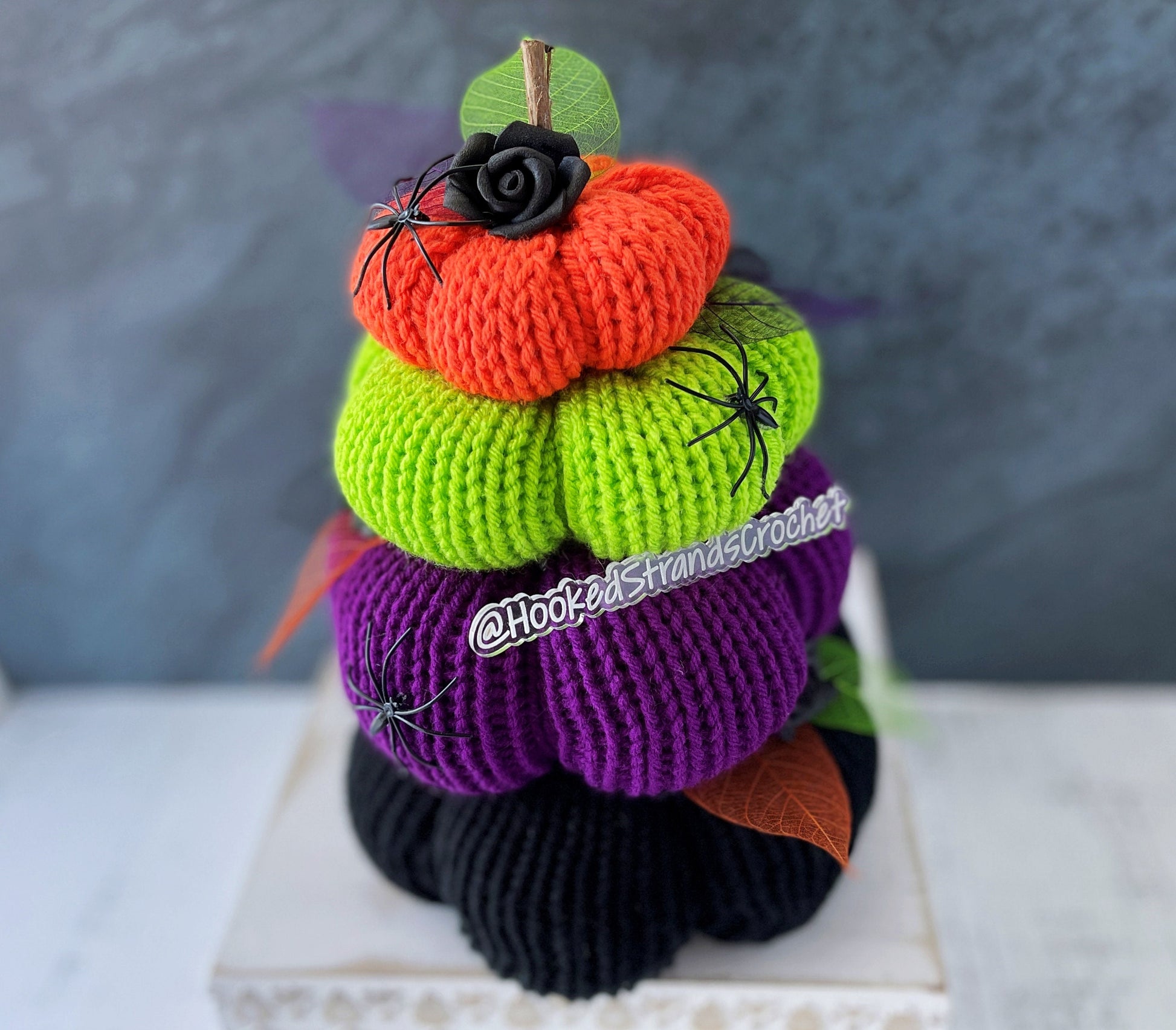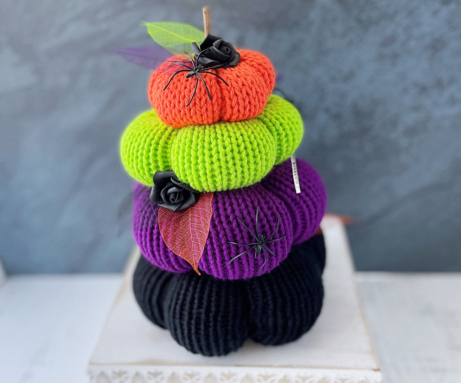 Spooktacular style made easy! Get your seasonal decor ready with this knitted pumpkin stack featuring a spooky twist - spiders! It's a great way to add a festive touch to your tiered tray. (Cackle at your own risk!)