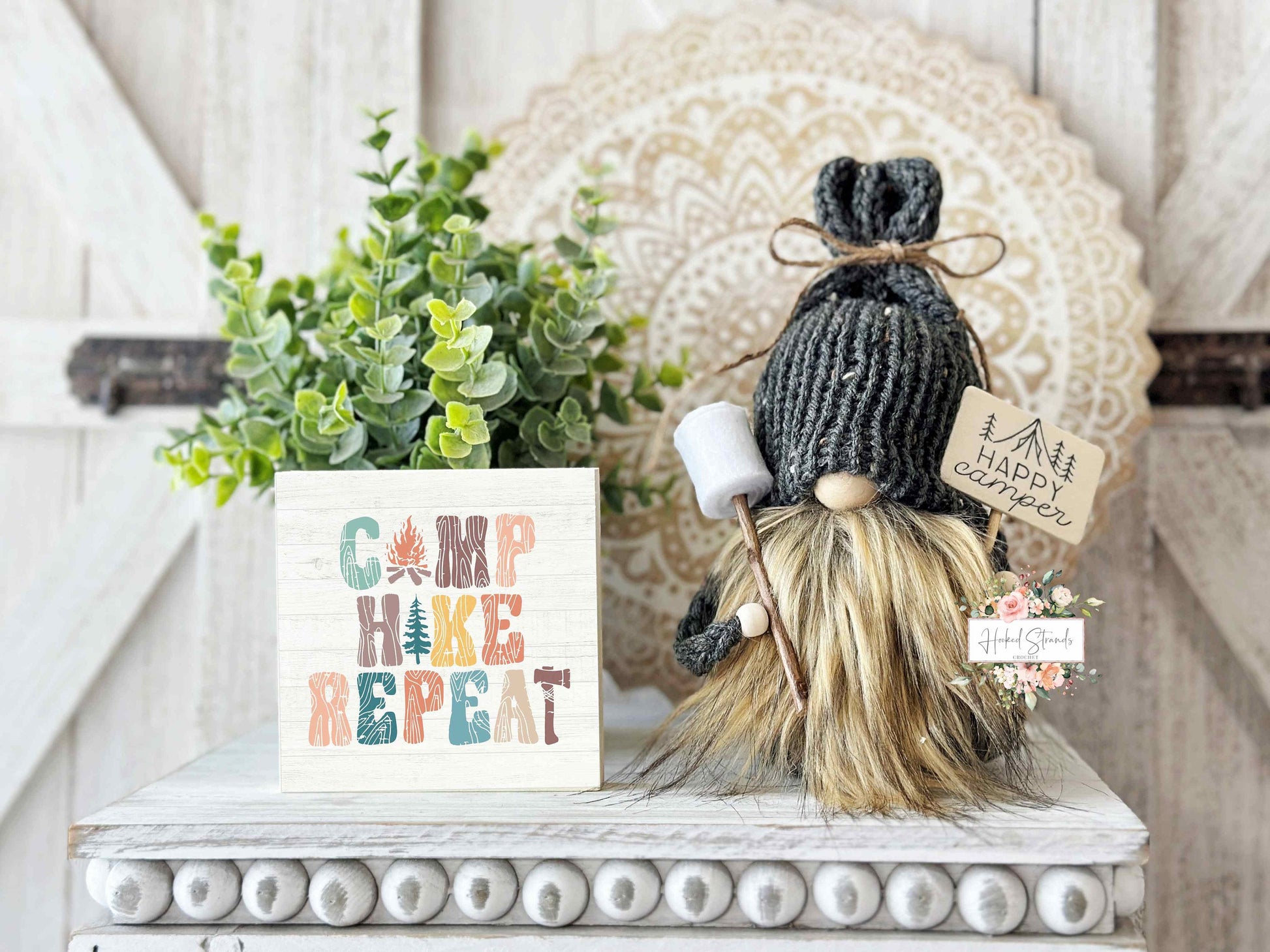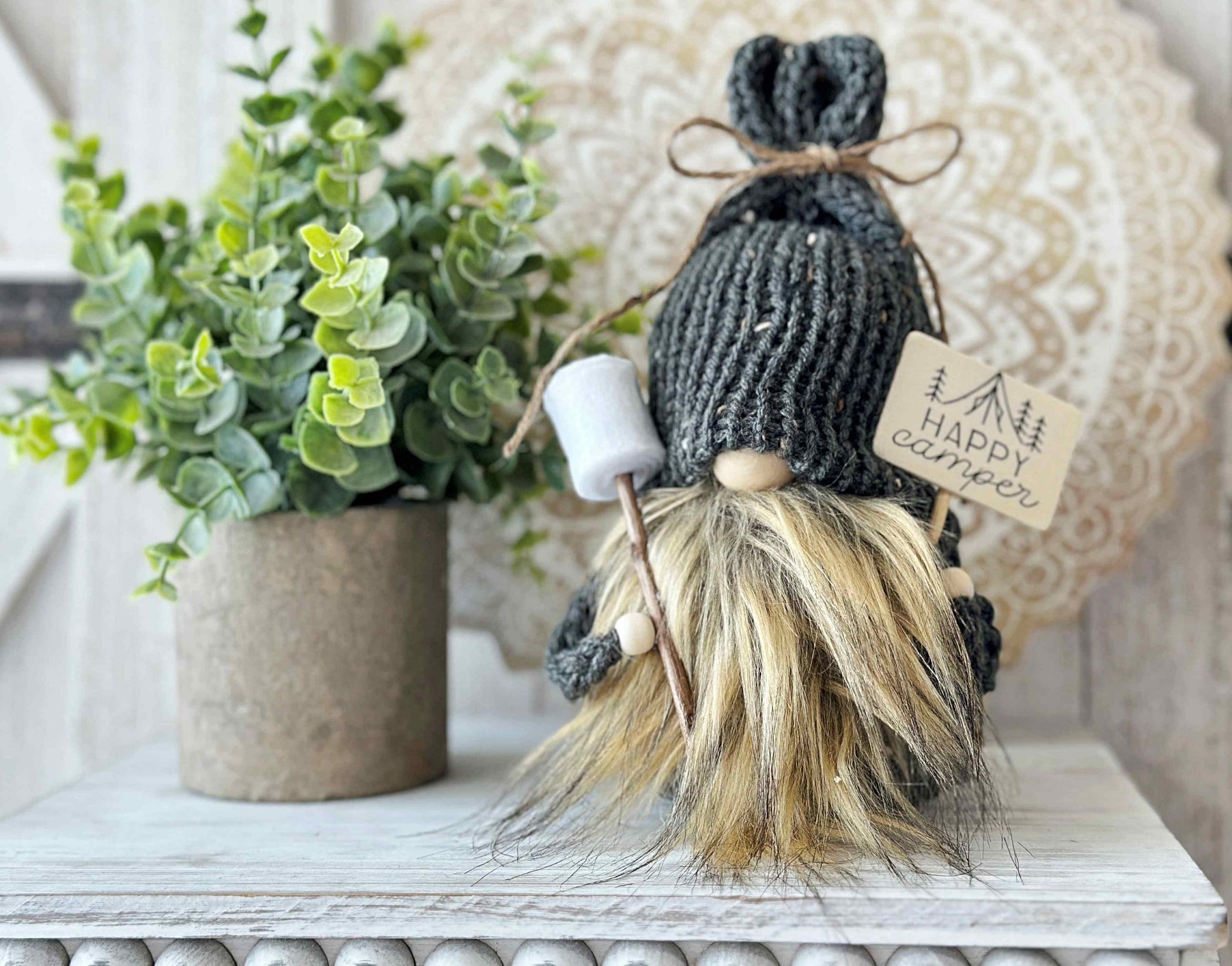Outdoorsy knit happy camper gnome with marshmallow and sign - Tiered tray decor