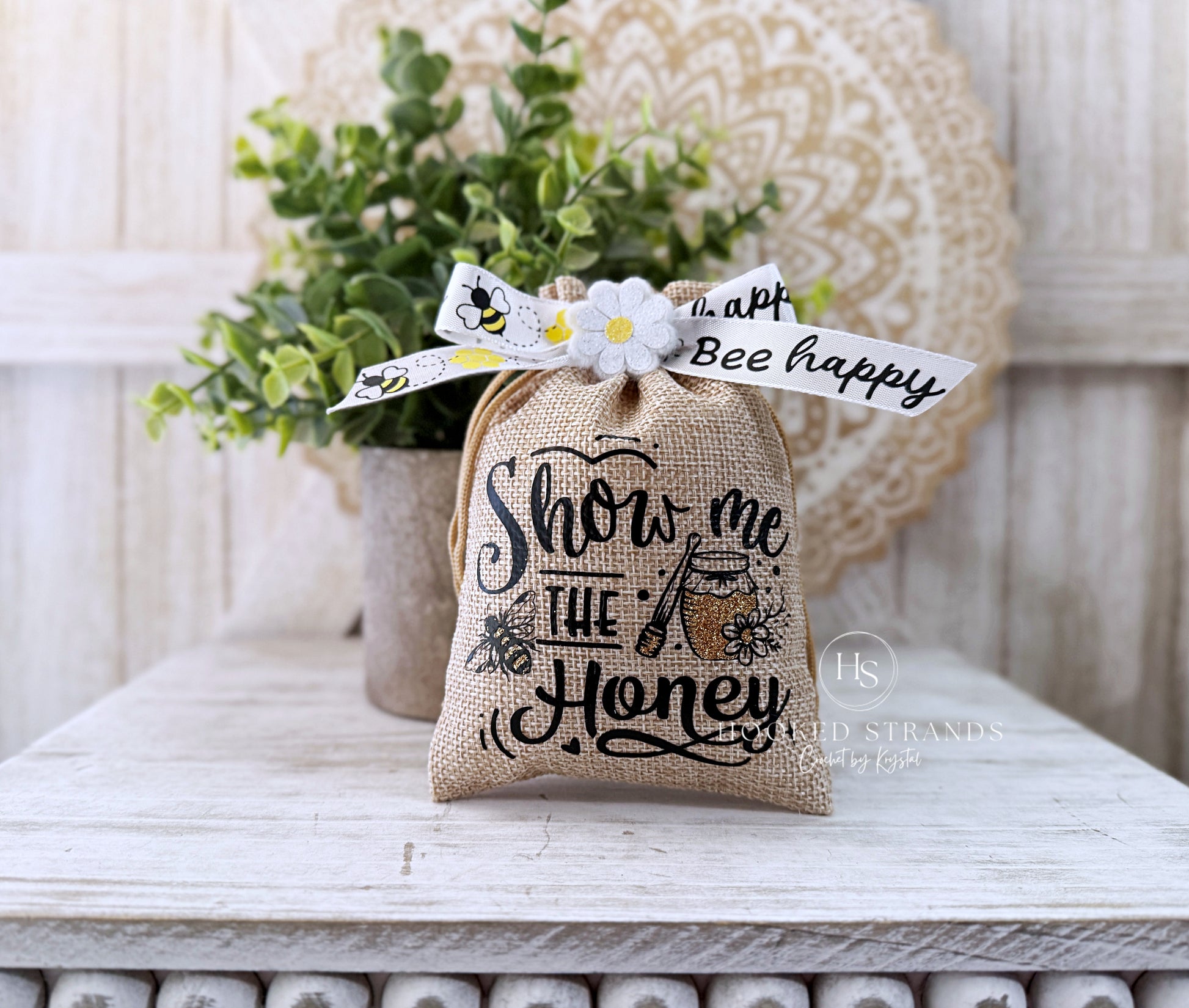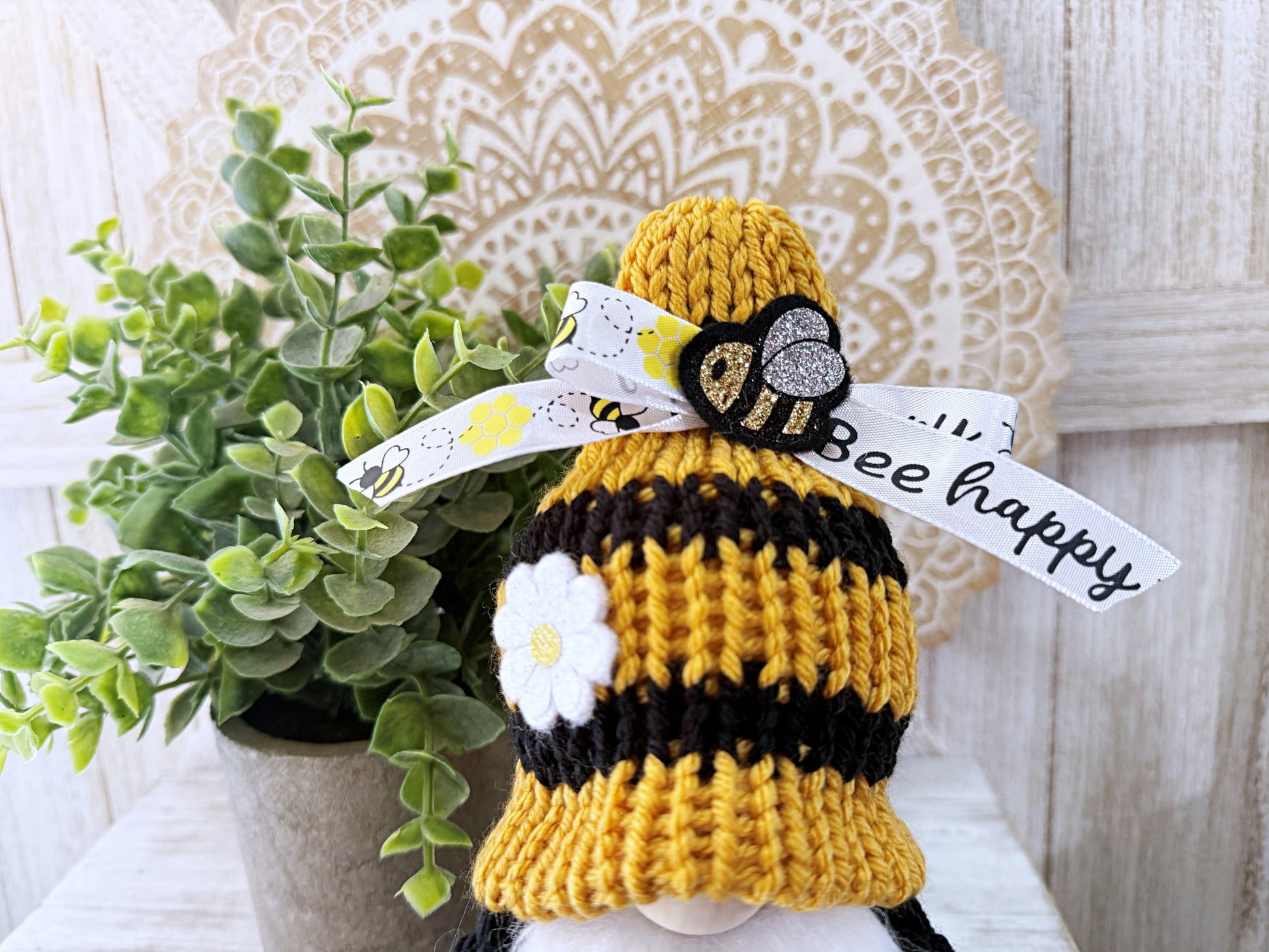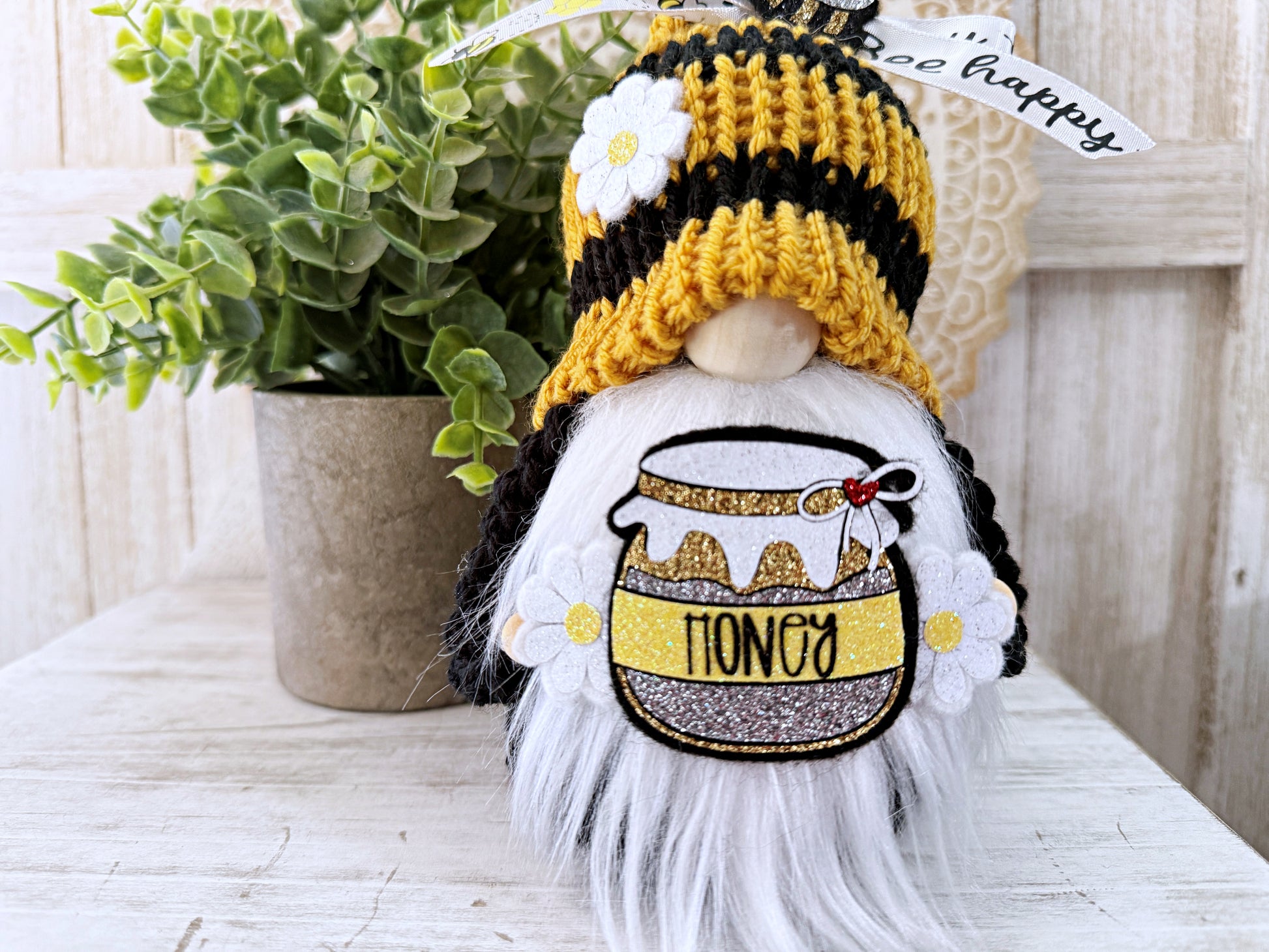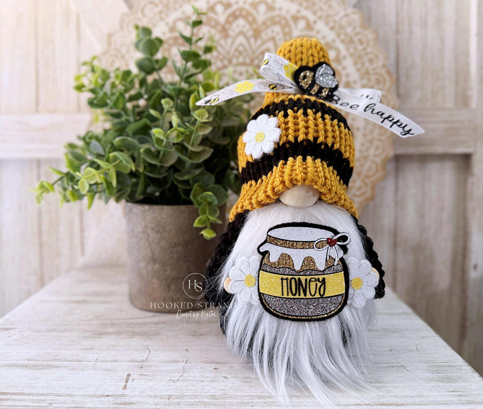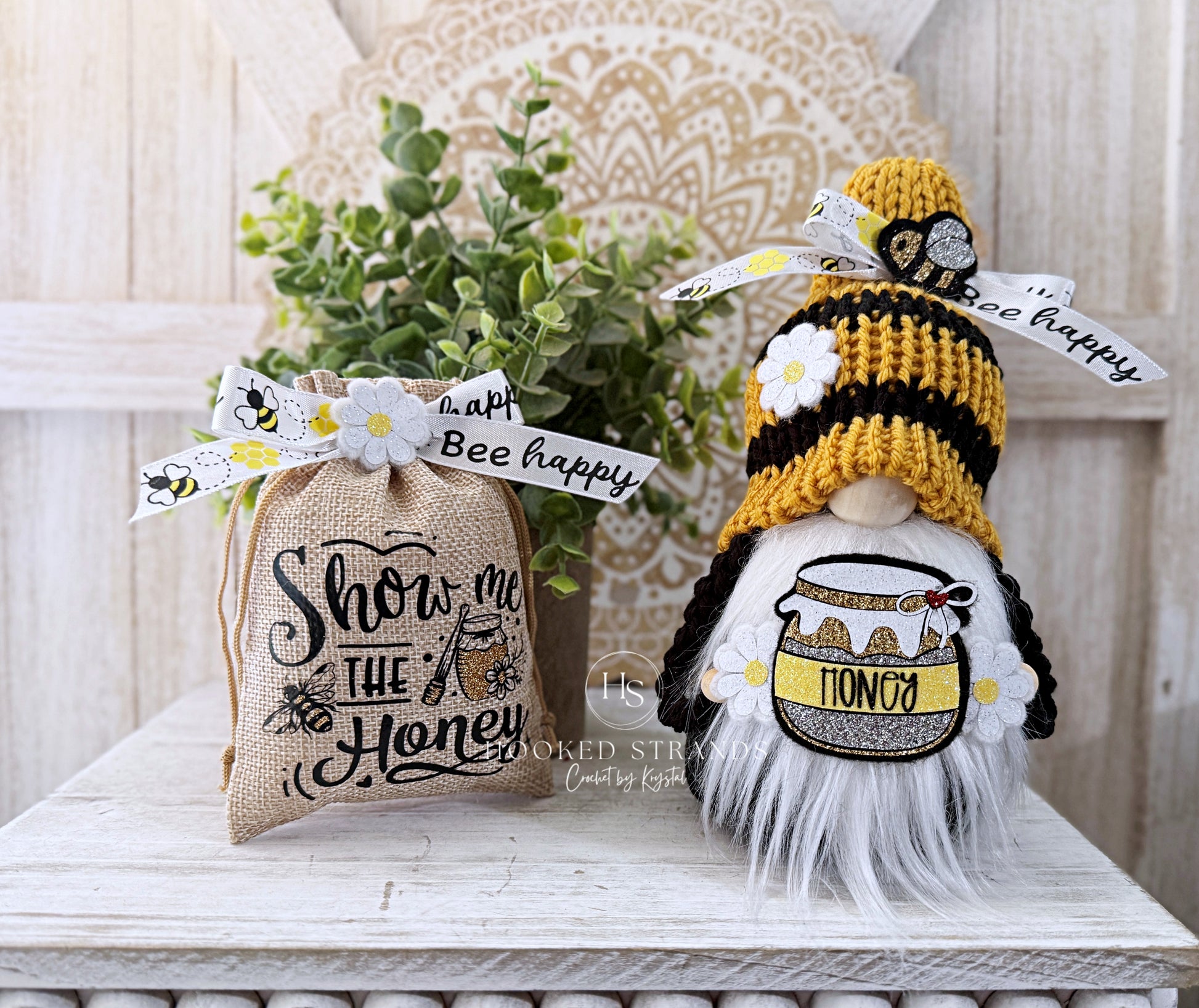 This honey bee gnome is sure to bring a smile. This little knit gnome is holding a honey pot and has a bee themed ribbon on his hat. Also available is the "Show me the honey" mini burlap bag- sold seperatley