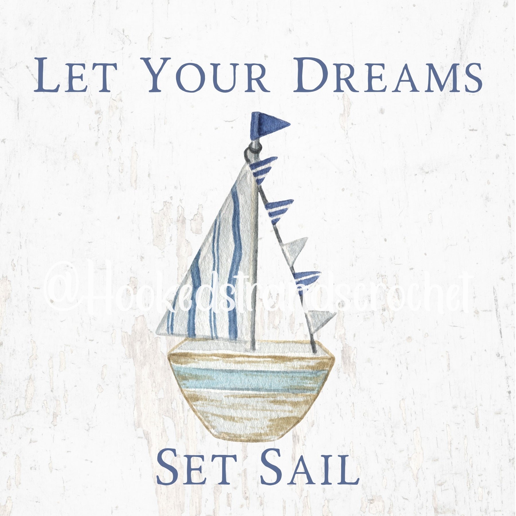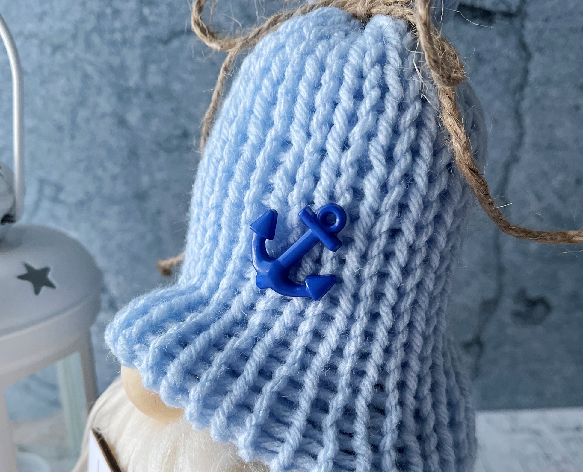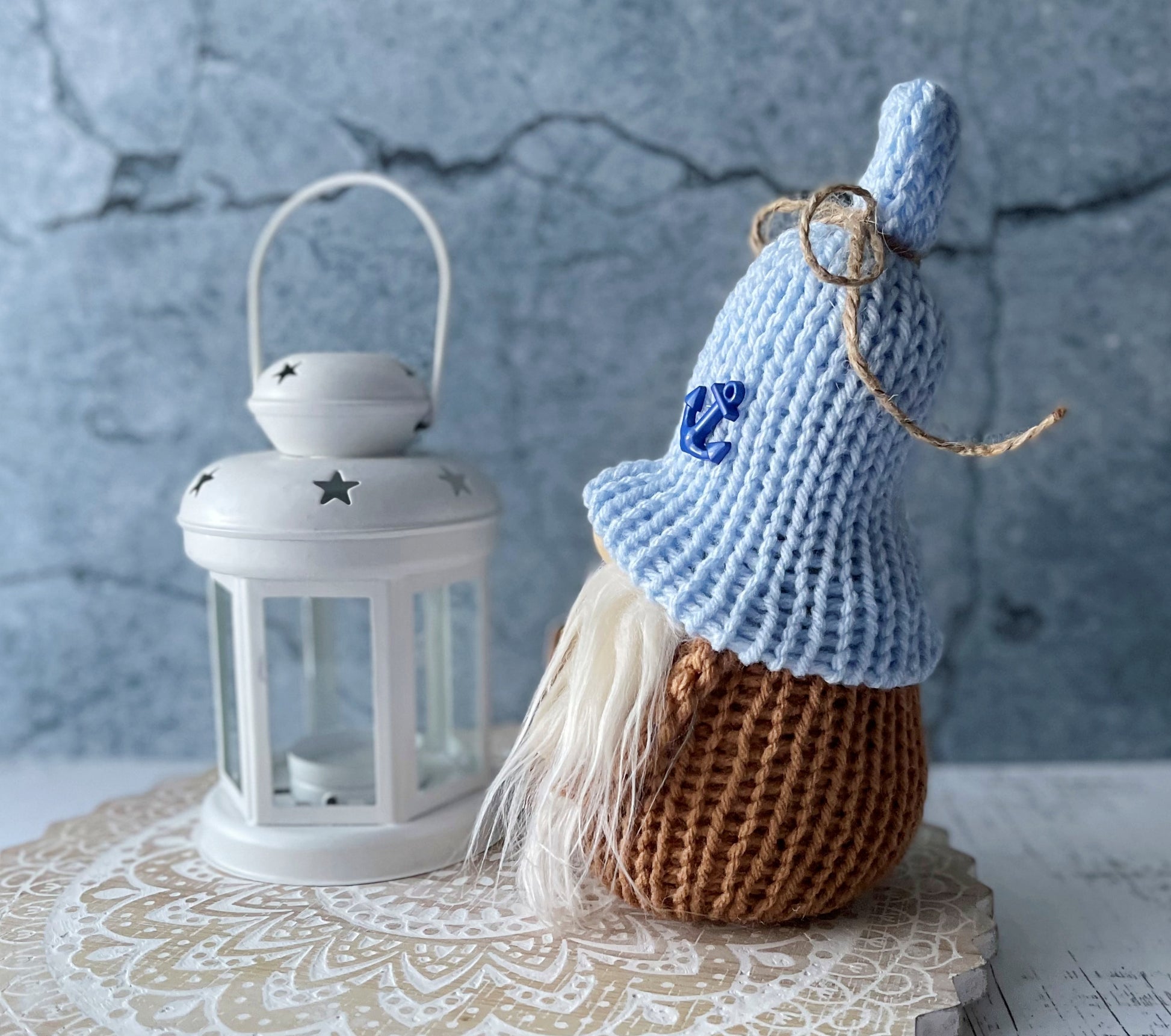 This little knit gnome is holding a sign and has an anchor on his hat. Made with your sign choice