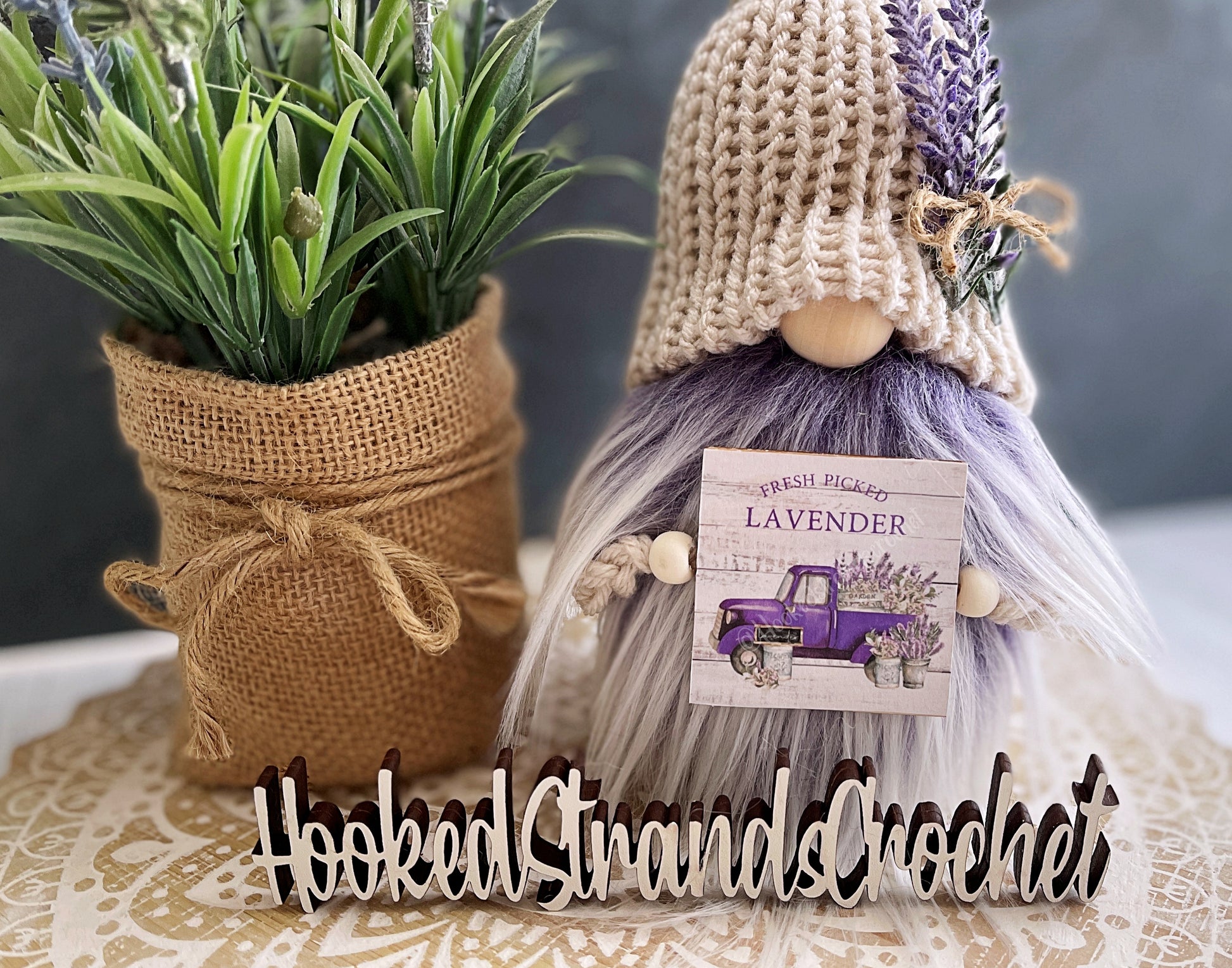 This farmhouse gnome is has sprigs of lavender and a lavender themed sign