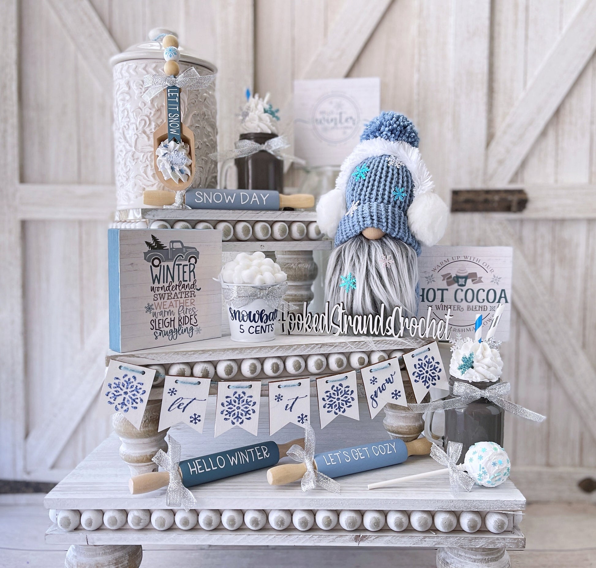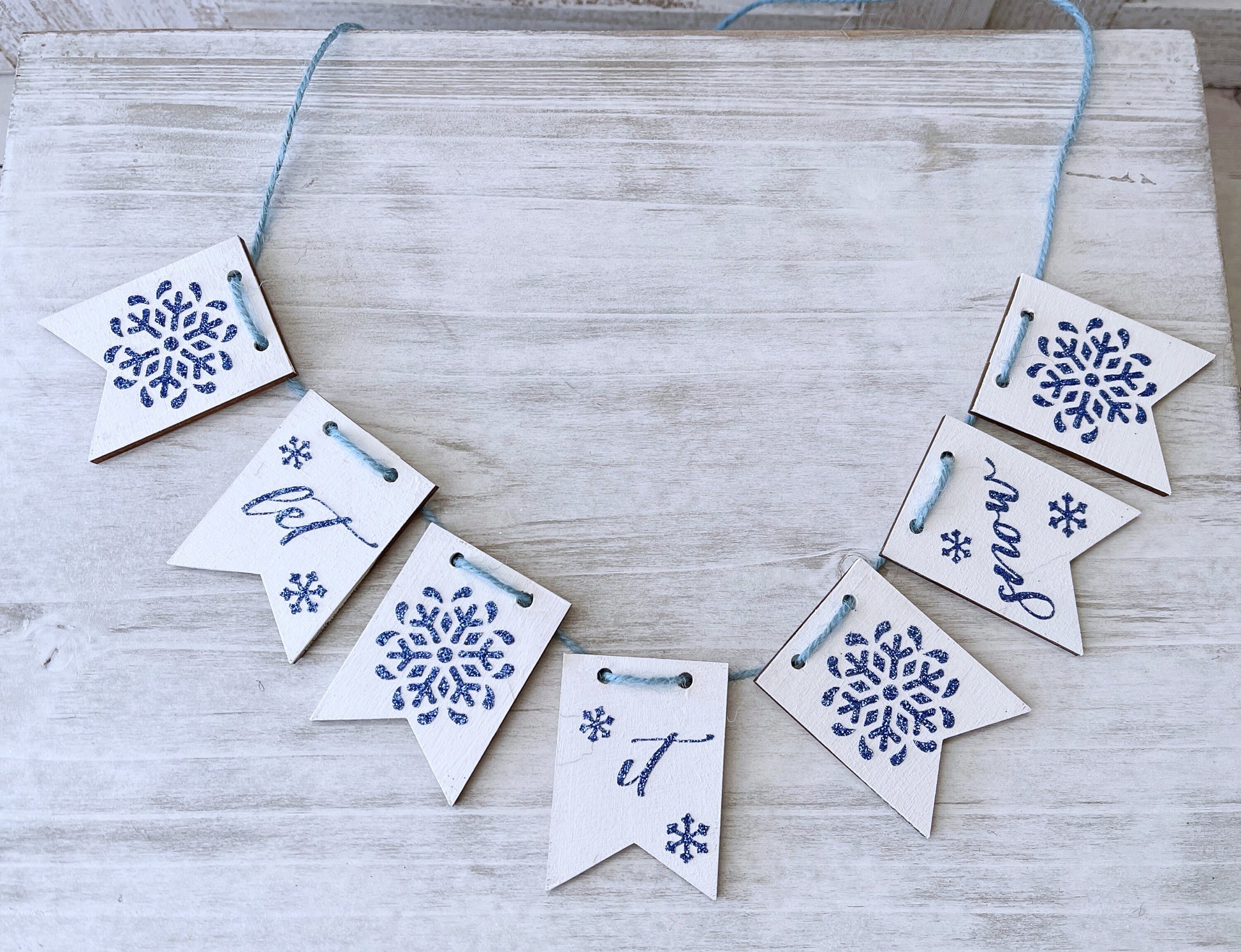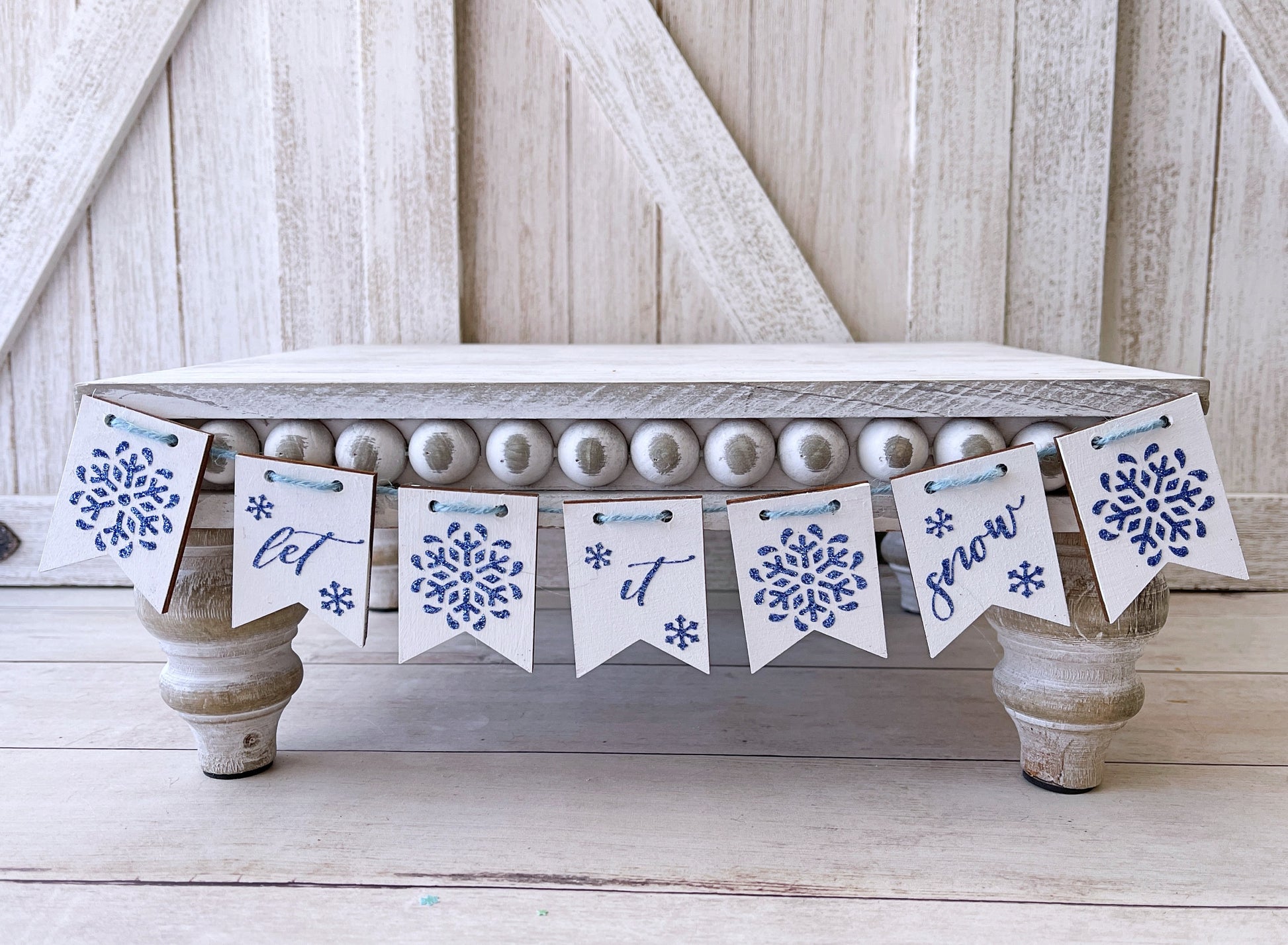 This let it snow garland will add a festive touch to your tiered tray decor or Christmas decor. It includes seven wood banners with different designs.