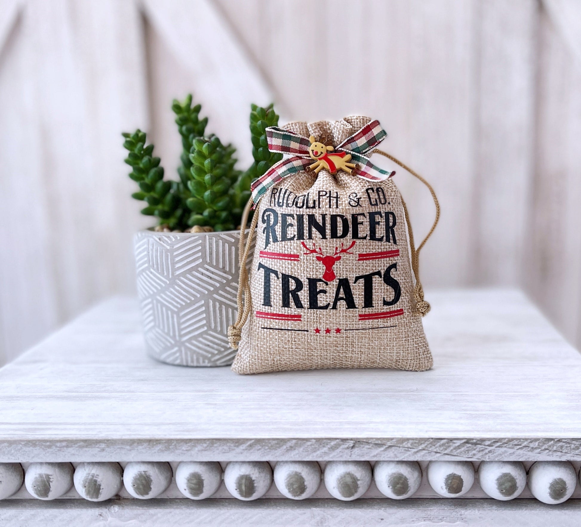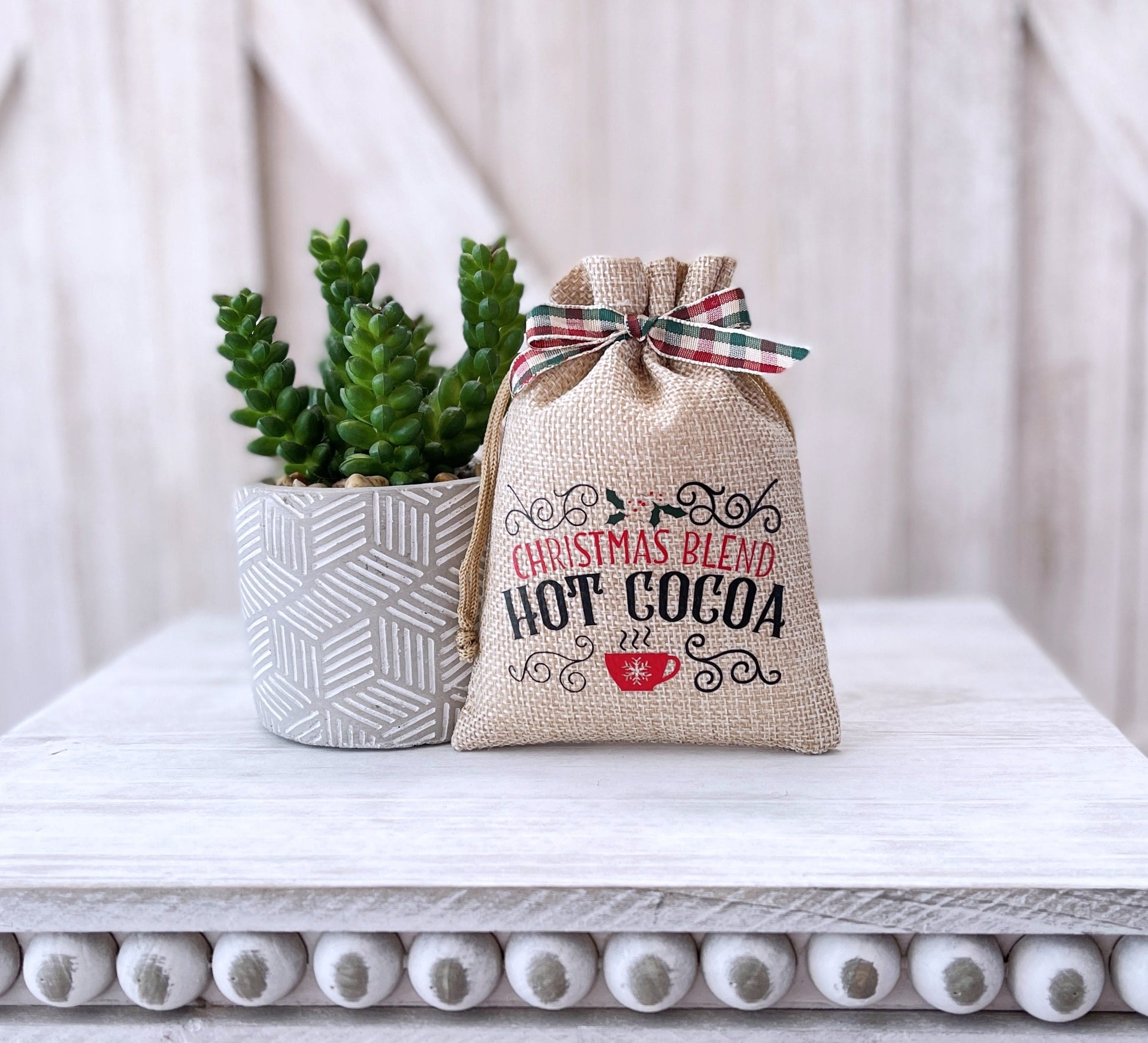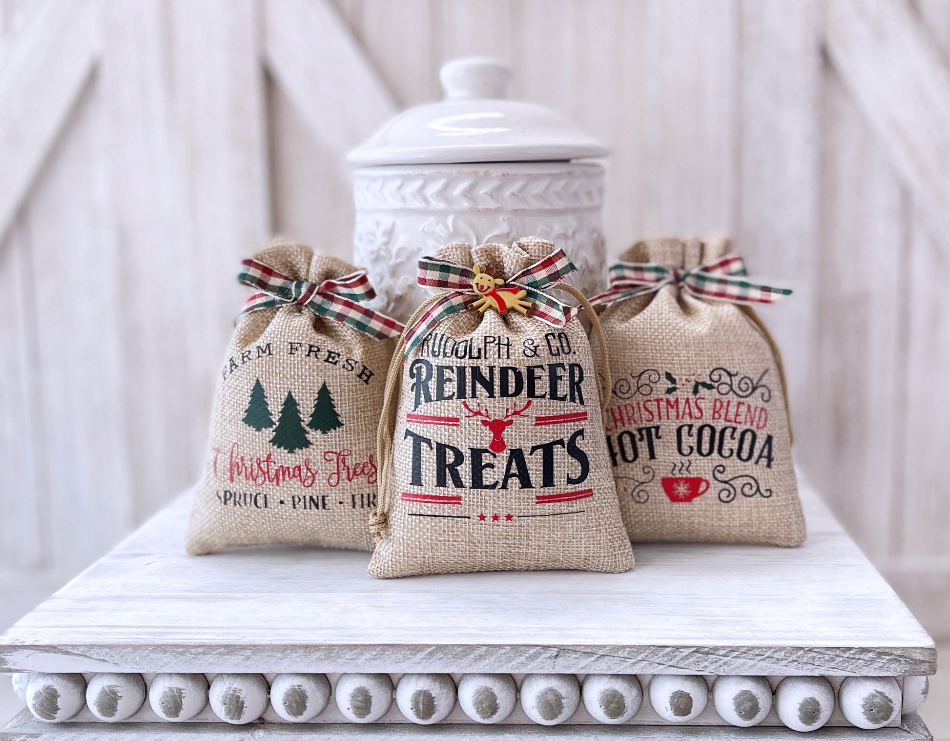 This Mini Christmas sack is a cute way to add to your Winter Tiered tray decor. They work great for a Christmas tabletop display or Mantle.