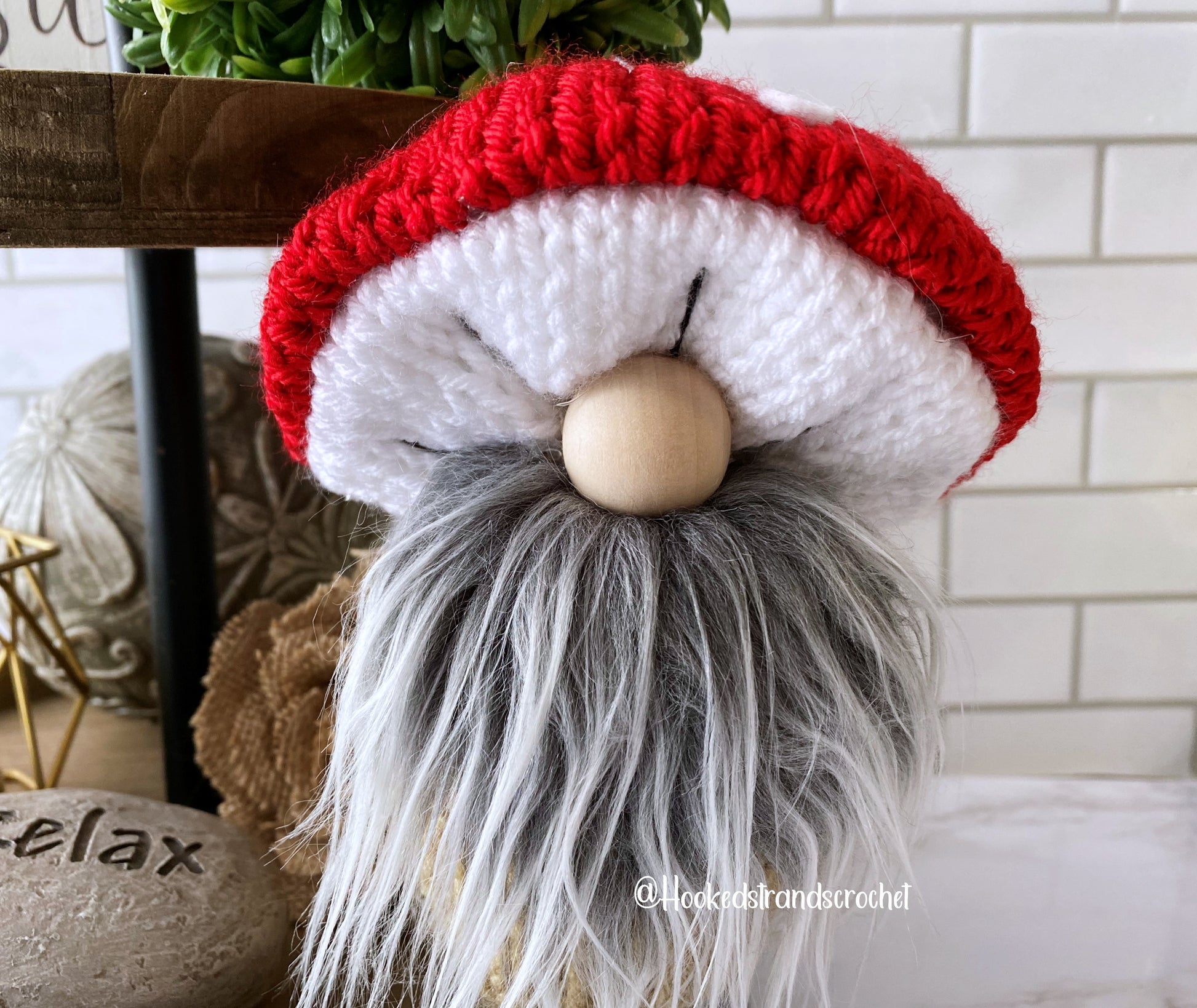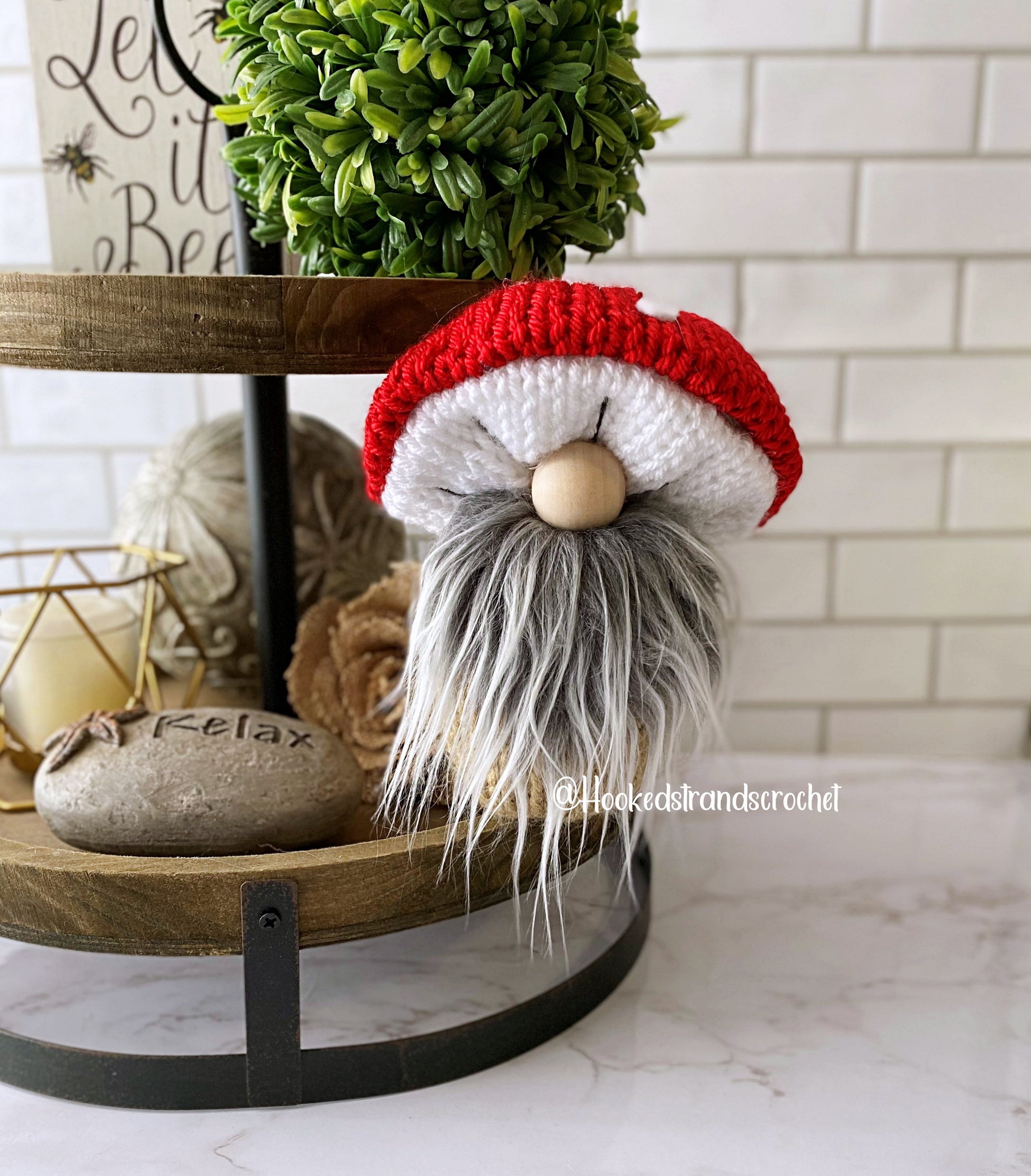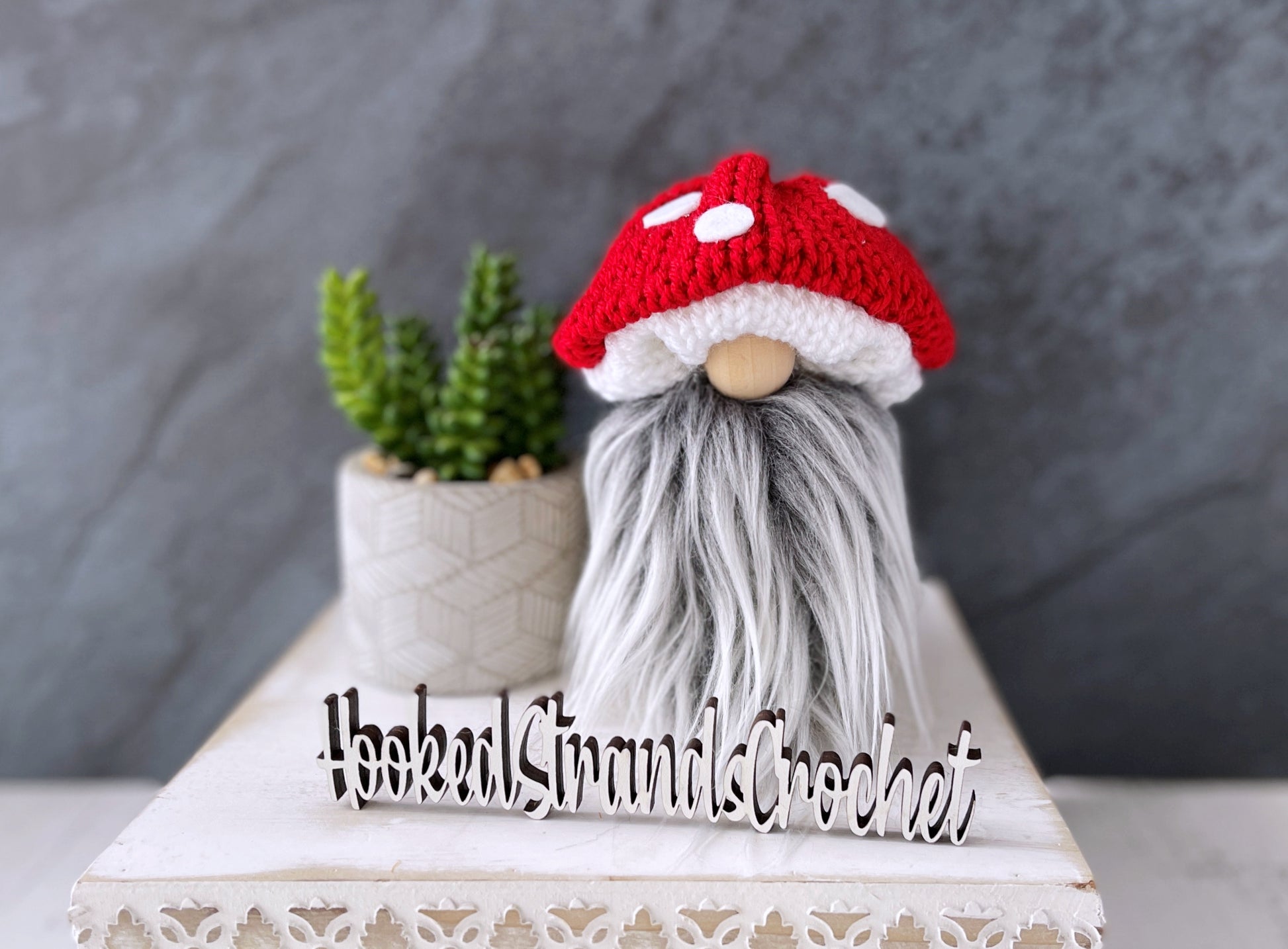 This mushroom gnome knit doll is a unique way to add to your gnome decor or tiered tray. Forest gnome has a mushroom cap with white felt spots