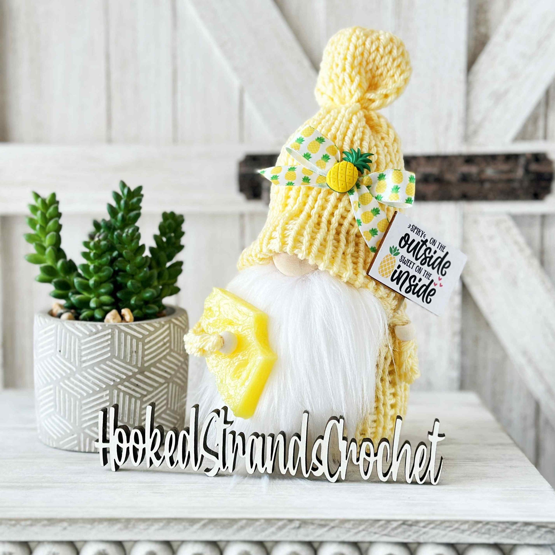 Playful yellow knit pineapple gnome with sign - tiered tray decor