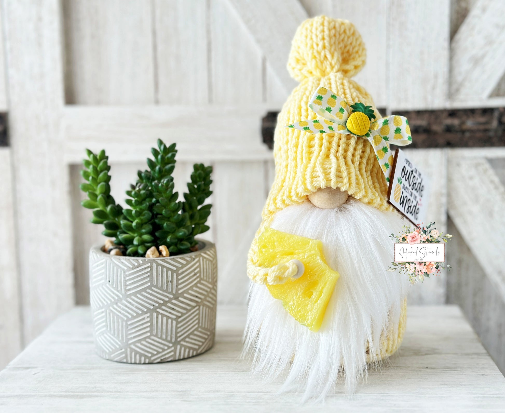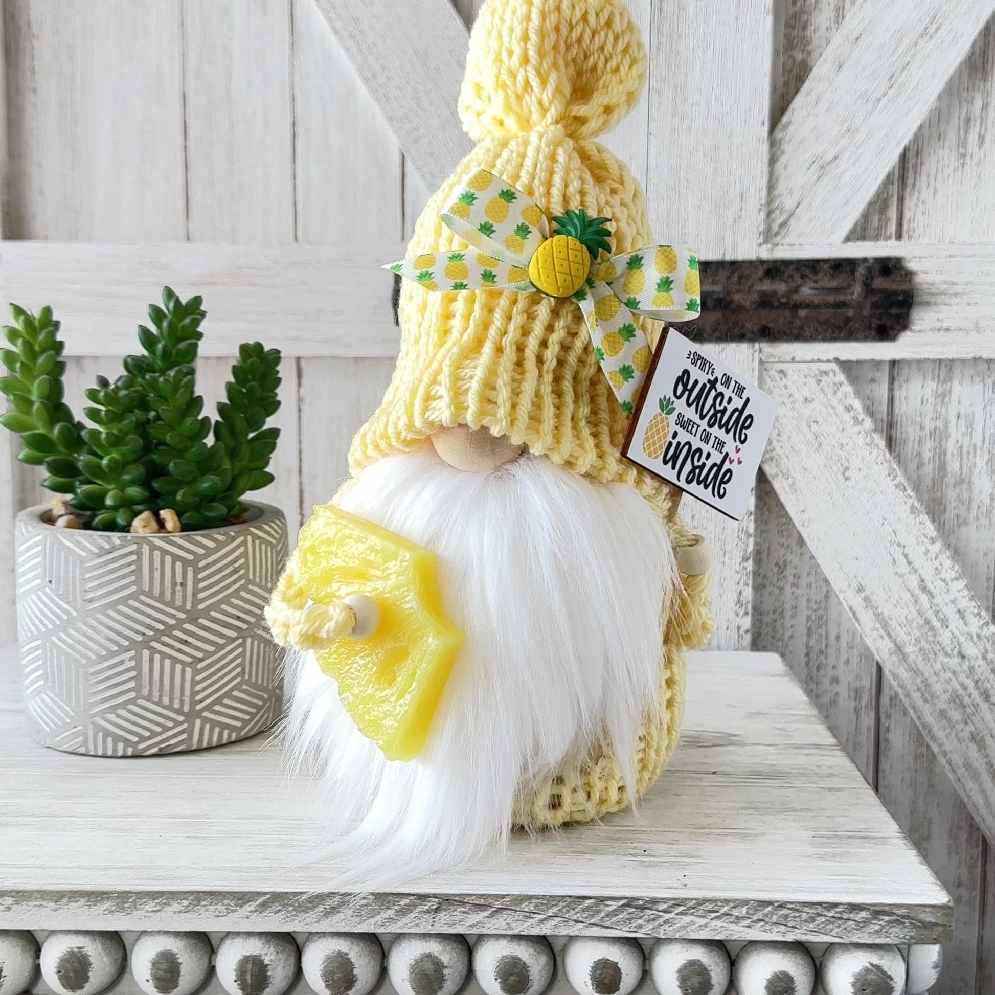 Brighten up your space with this playful and fun yellow pineapple gnome! This unique tiered tray decor is made of knitted fabric with a cute sign. Let this friendly gnome bring some unexpected joy, sunshine, and laughs to your home. !!!