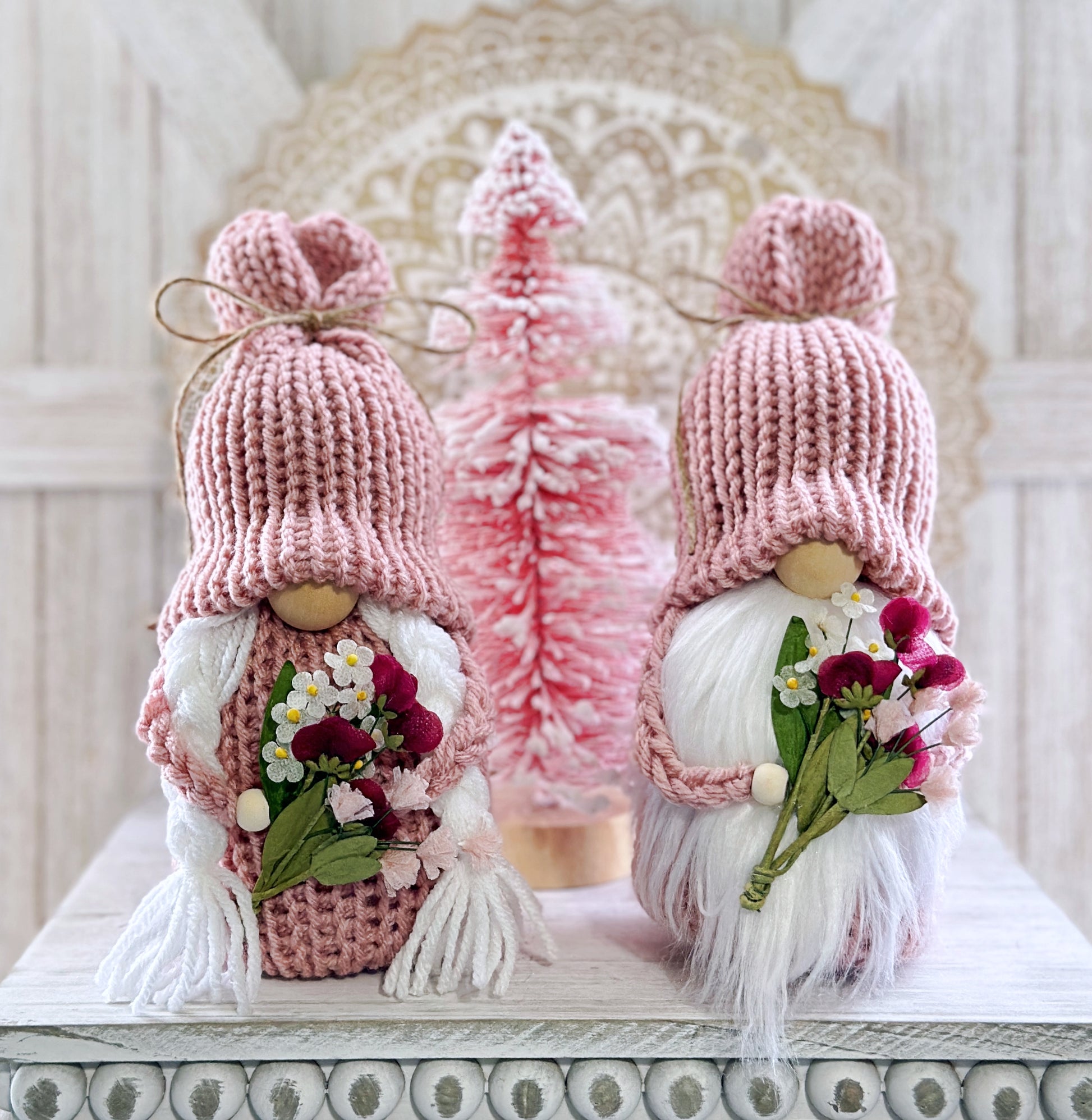 This farmhouse gnome is made with a soft pink yarn and has a pretty bouquet of flowers.