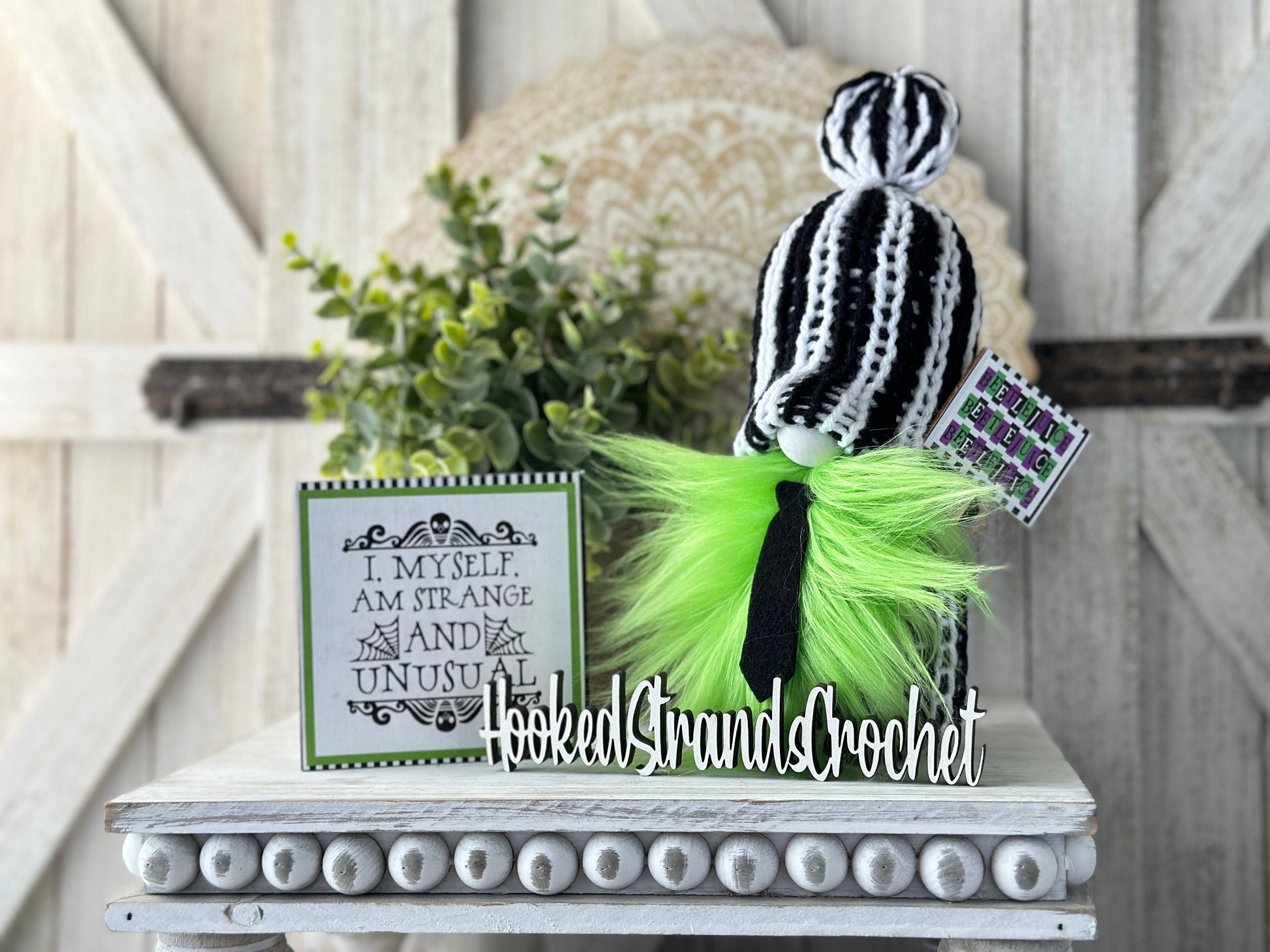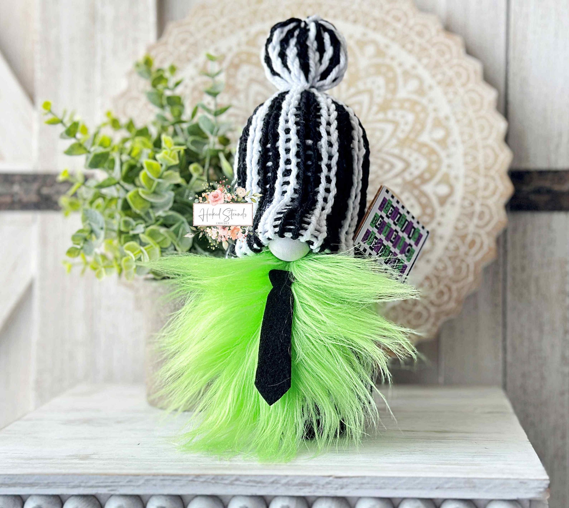 Add a touch of Halloween magic to your home with our delightful Beetlejuice gnome. He is knit with love, this shelf sitter is perfect for transforming your tiered tray decor into a whimsical Halloween haven. With its vibrant striped outfit and playful sign, this adorable gnome is a must-have for any Halloween enthusiast. Whether you display it in your living room, kitchen, or office, our Beetlejuice gnome will surely make a charming and festive addition to your Halloween decorations. Get ready to welcome in the spooky season with this unique knit gnome!