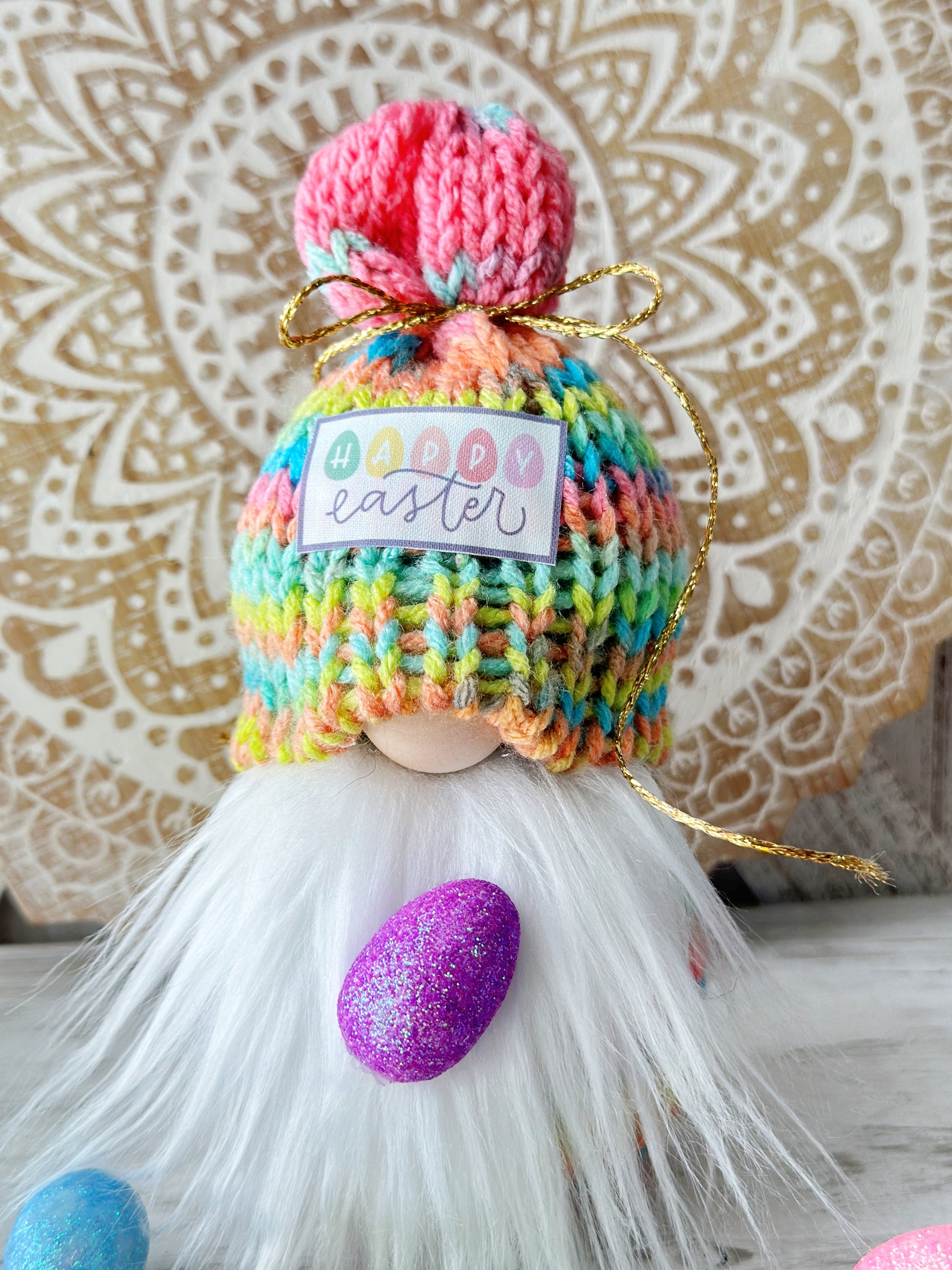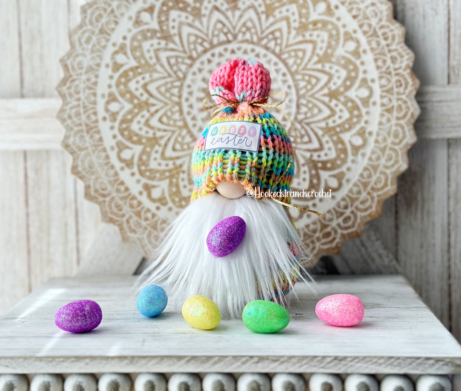 Introducing our adorable Happy Easter gnome, perfect for adding a touch of whimsy to your tiered tray decor! Handcrafted with care by Hooked Strands Crochet, this delightful little gnome brings a joyful Easter vibe to any space. With his vibrant colors and charming design, he is sure to bring a smile to your face. Whether displayed on your mantel, shelf, or as part of a festive centerpiece, this Easter gnome is a must-have addition to your holiday decor. Made with love and attention to detail, he will make a wonderful gift for friends, family, or even yourself this season. Embrace the Easter spirit with our enchanting gnome, crafted specially to add a touch of happiness to your celebrations.