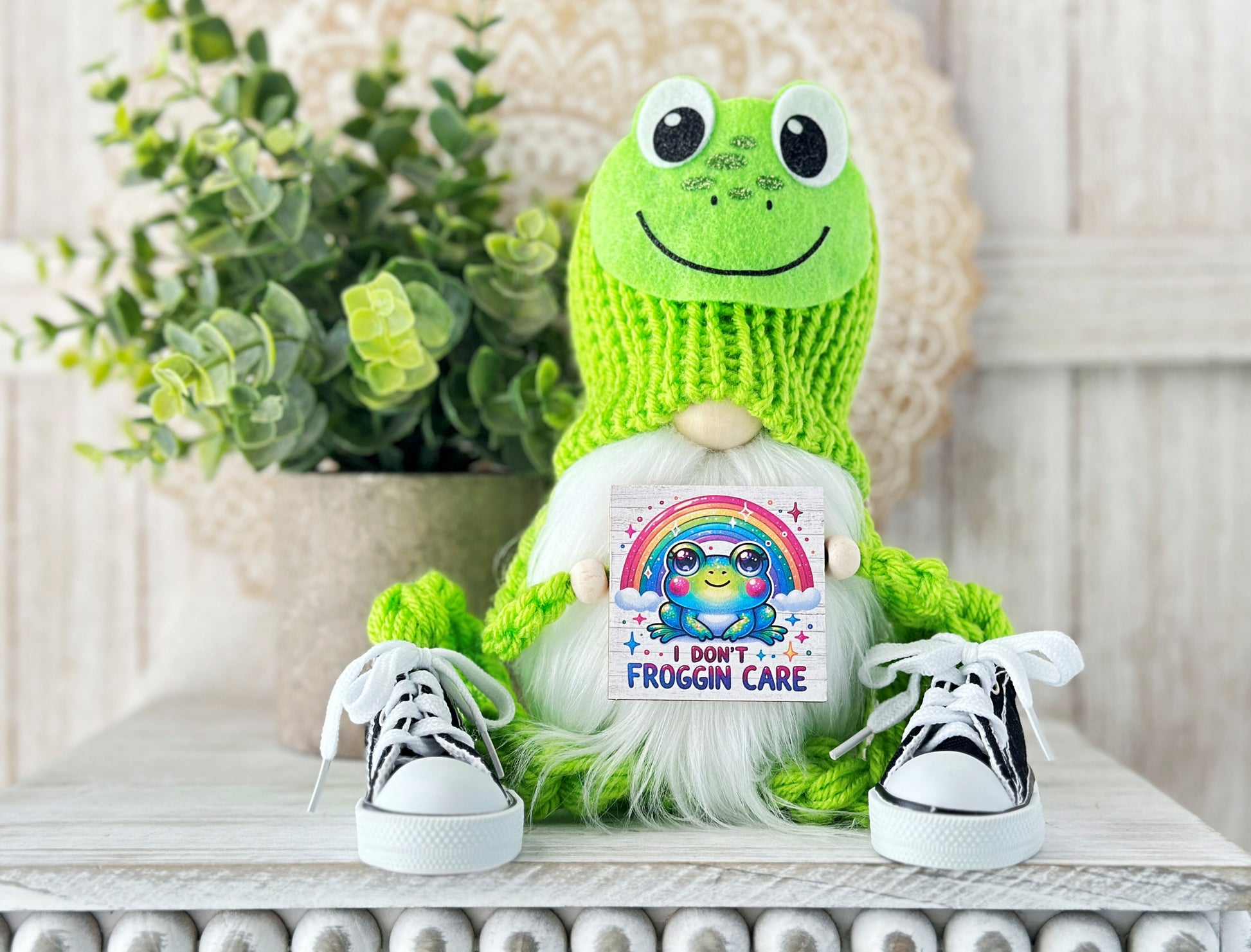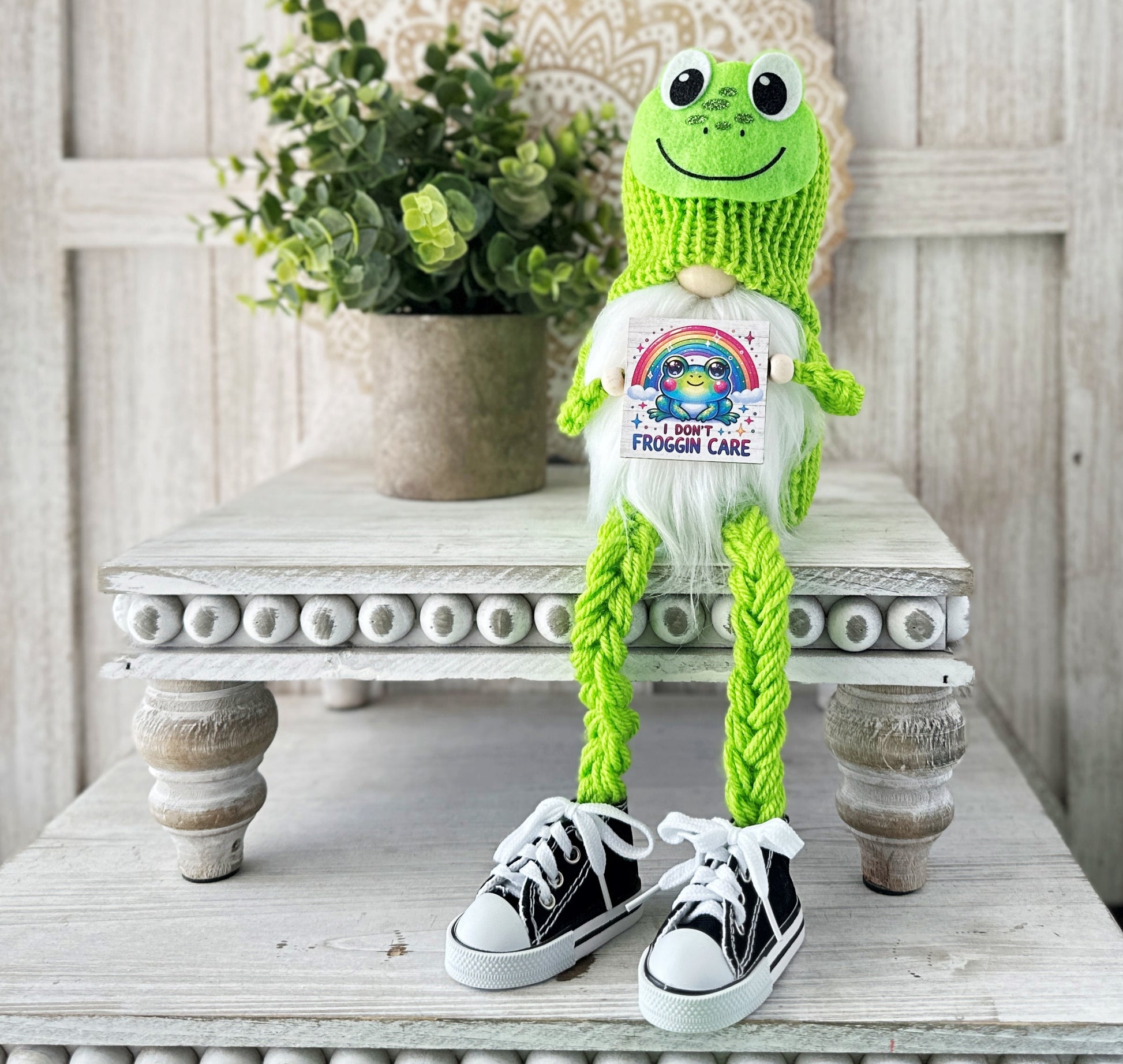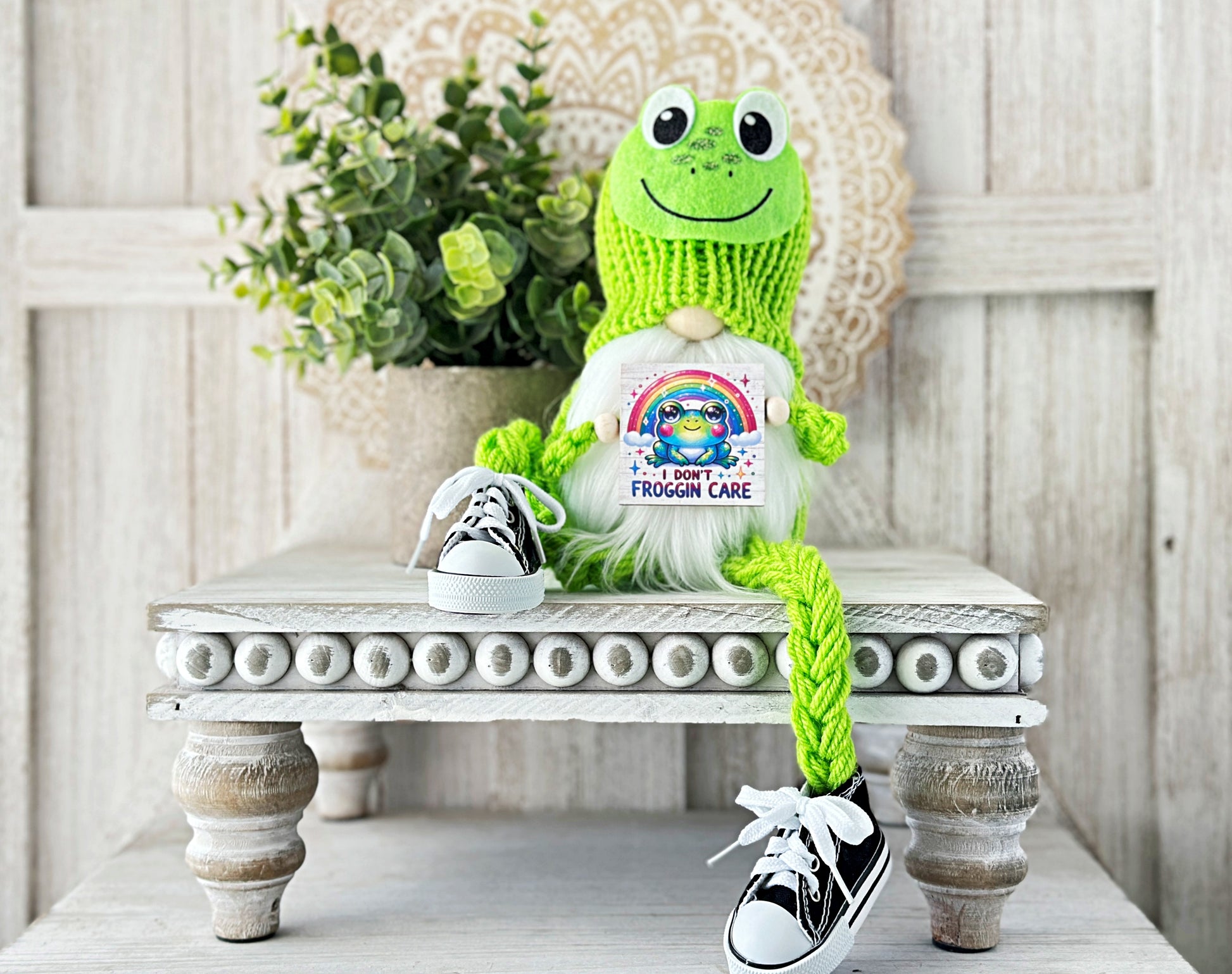 Add some cheeky fun to your tiered tray decor with this adorable Frog gnome with dangling legs. Dressed in tennis shoes and holding an I don't froggin care sign, this little guy is sure to bring a smile to your face every day. This unique and playful piece makes a perfect gift idea for anyone who loves cute and quirky home decor. Handcrafted with attention to detail, this Frog gnome will add a pop of fun to any corner of your home. Make your space a little more magical with this charming addition!