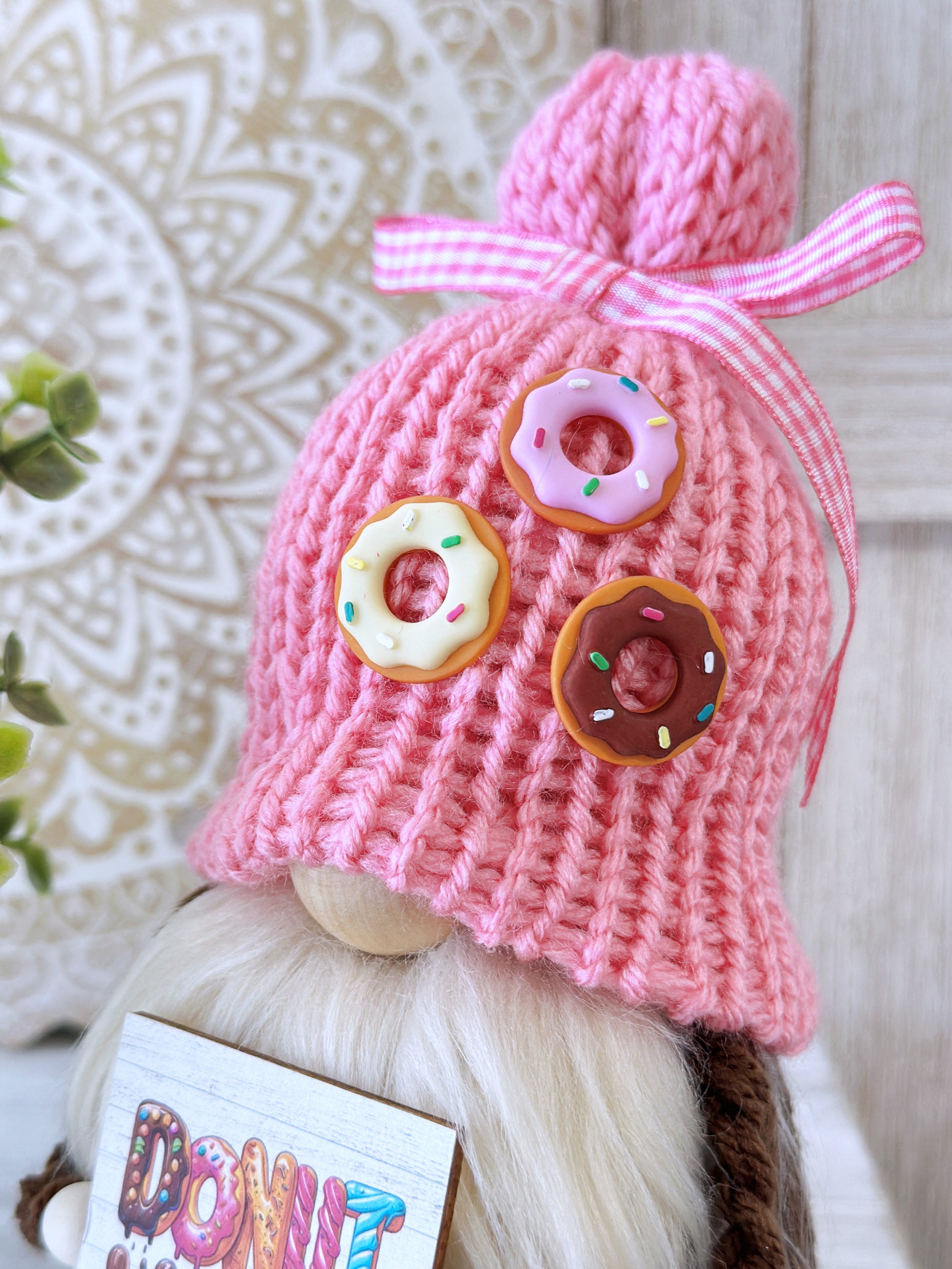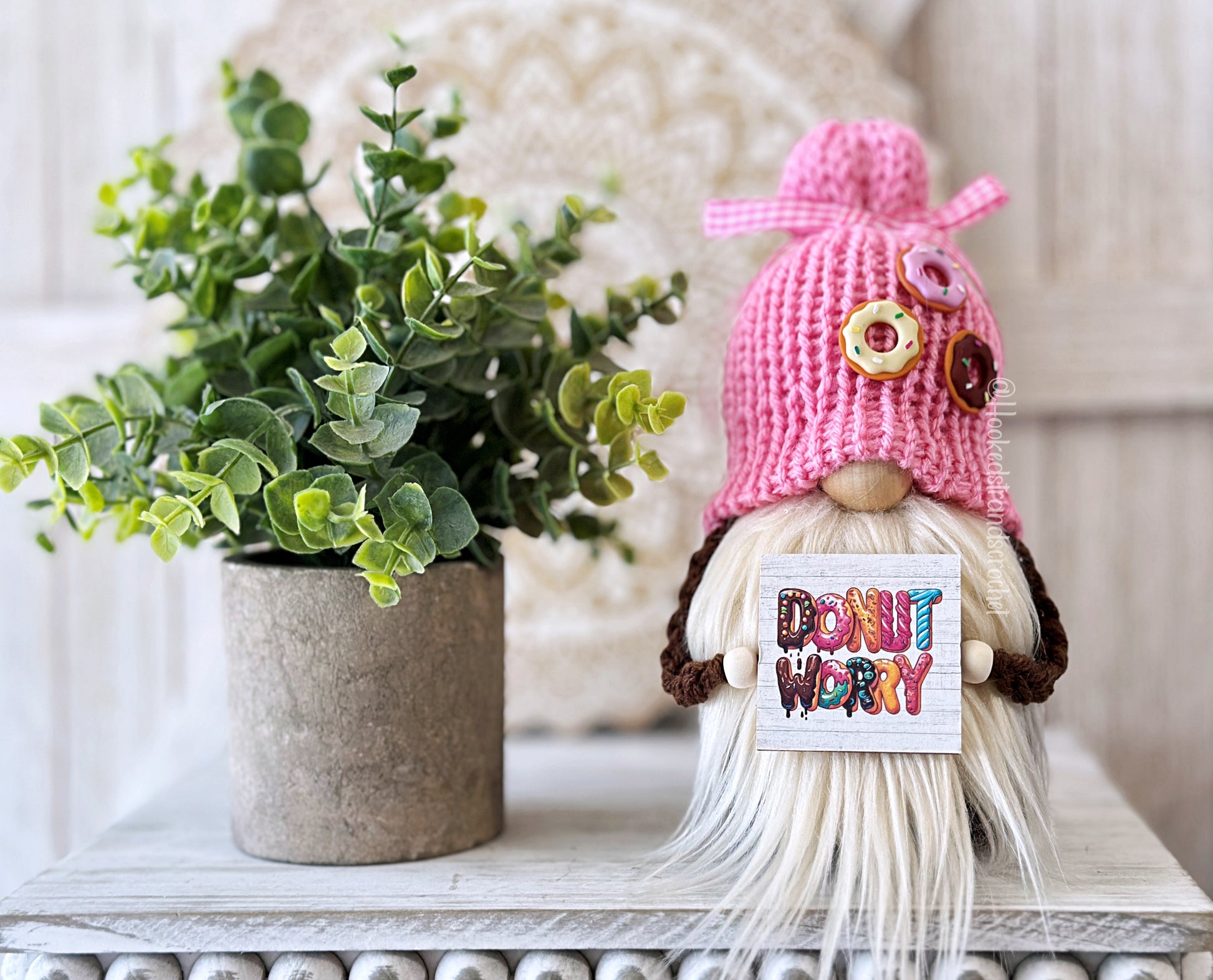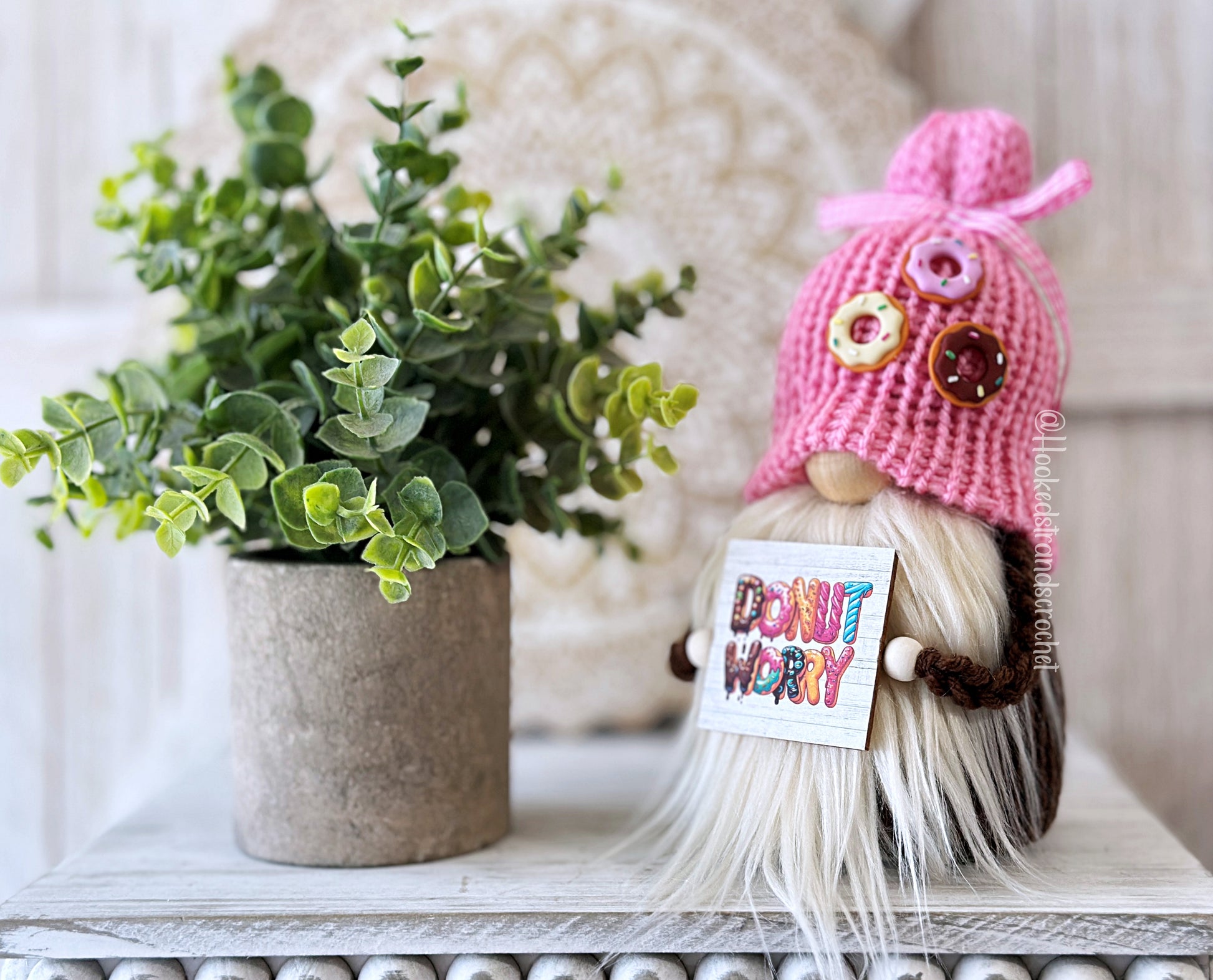 Introducing our adorable donut-themed knit gnome, the perfect addition to your tiered tray decor! This charming little gnome is a must-have for any donut lover out there, making it a delightful gift idea for birthdays, holidays, or just because. With its whimsical design and sweet details, this gnome holding a sign of your choice adds a touch of whimsy to any space. Handcrafted with love and attention to detail, this unique piece is sure to bring a smile to your face every time you see it. Add a sprinkle of fun to your home decor with our donut-themed gnome today!