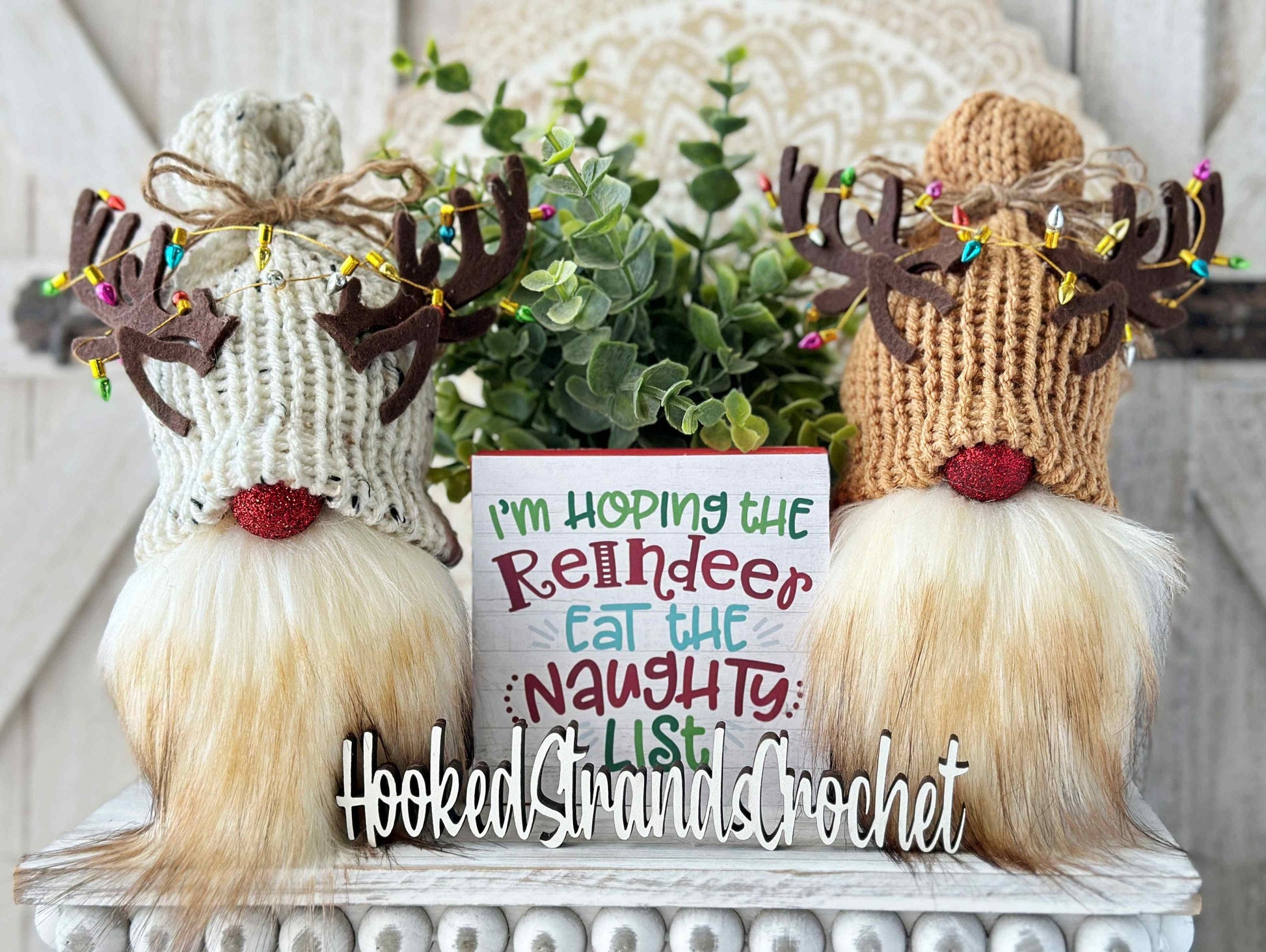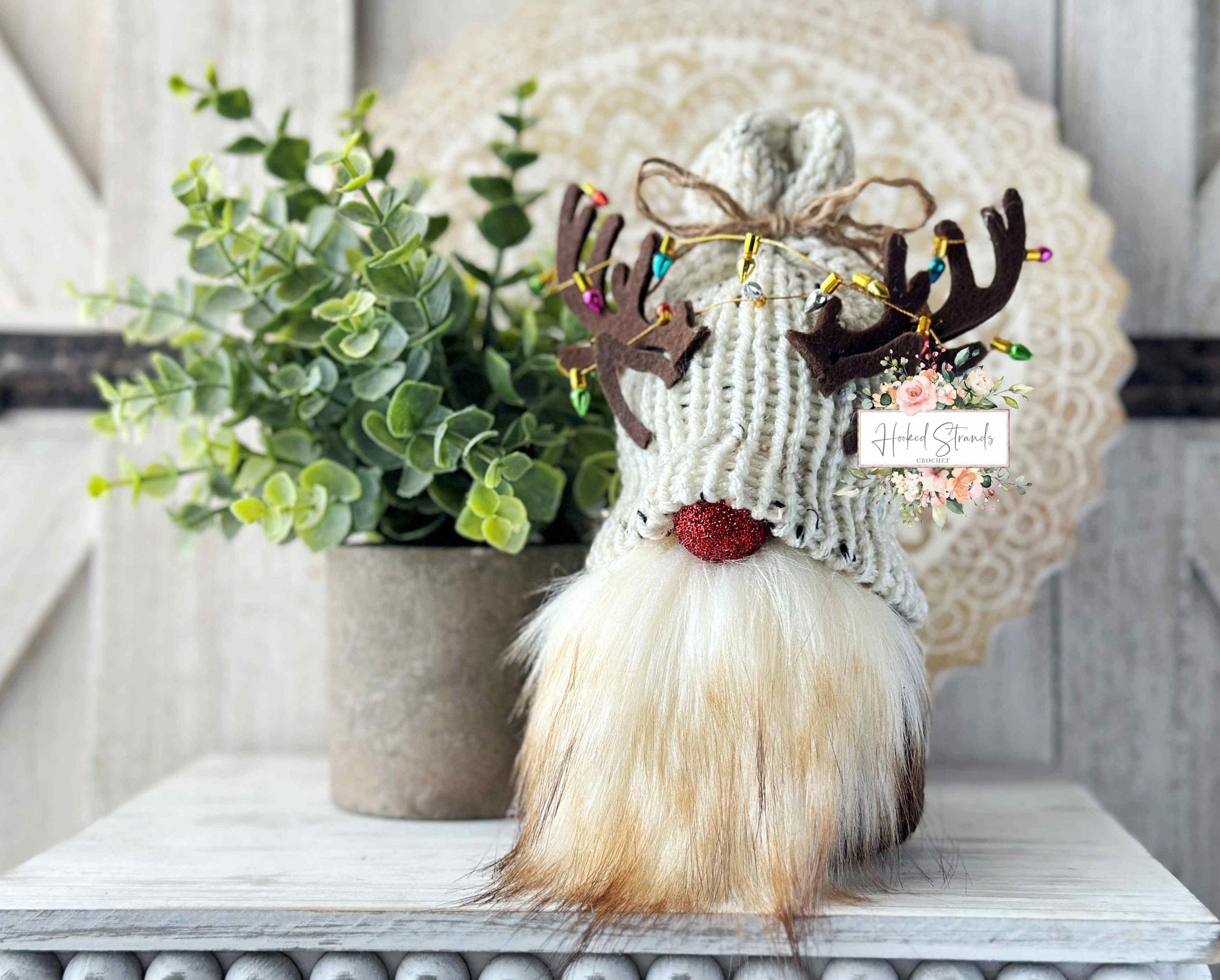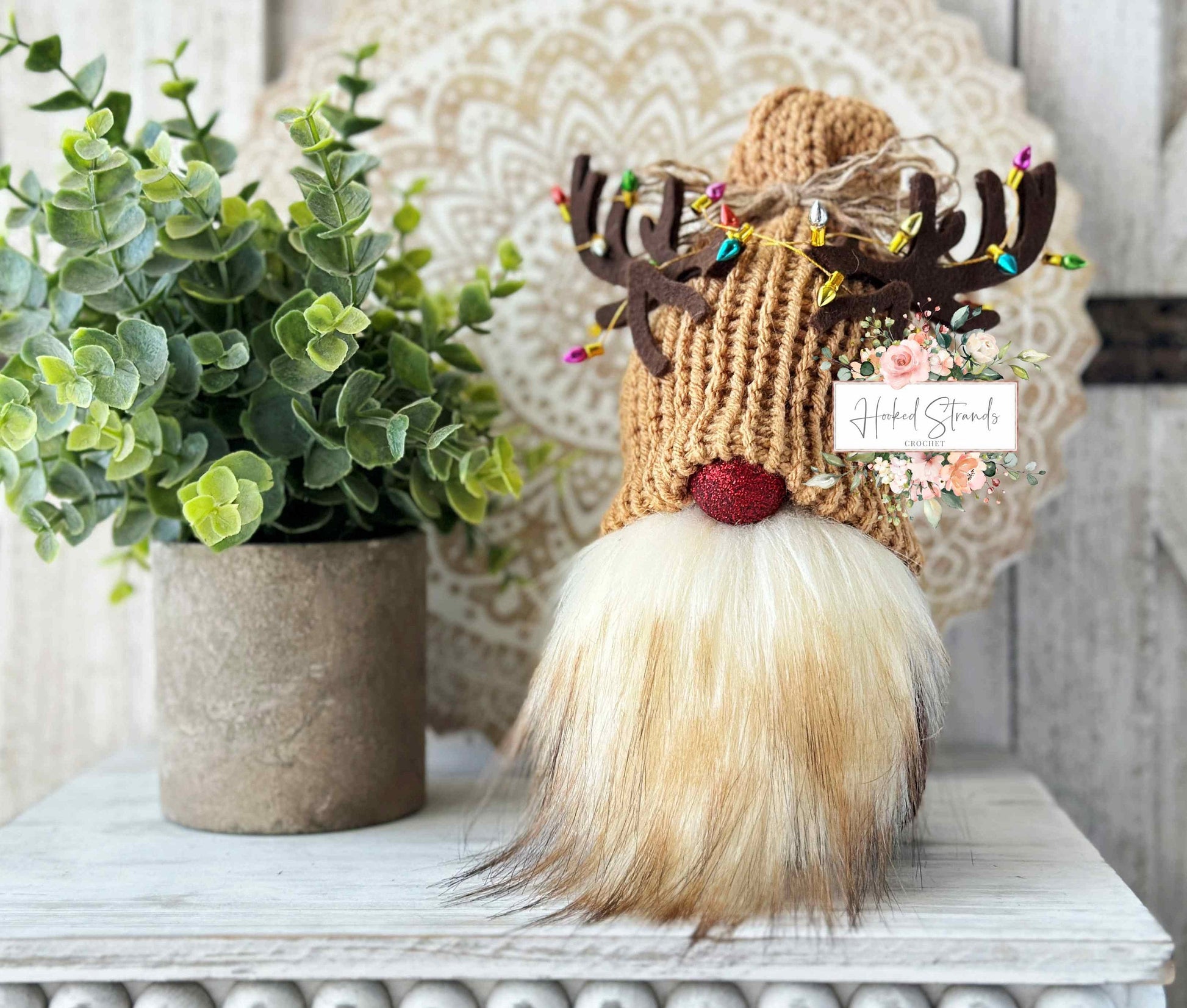 Introducing our adorable Knit Rudolph the Reindeer Christmas Gnome with Tangled Lights, designed by Hooked Strands Crochet! This handmade creation is the perfect addition to your tiered tray displays, adding a festive touch to your holiday decor. Crafted with love and attention to detail, this gnome features a charming Rudolph design, complete with a sparkly red nose and antlers. The whimsical twist comes with the addition of tangled lights in his antlers, creating a playful and unique element. Made using high-quality knit material, this Christmas gnome is not only cute but also durable for lasting enjoyment. Whether placed on your mantle, shelf, or tiered tray, this delightful gnome will surely bring joy and cheer to your home during the holiday season.